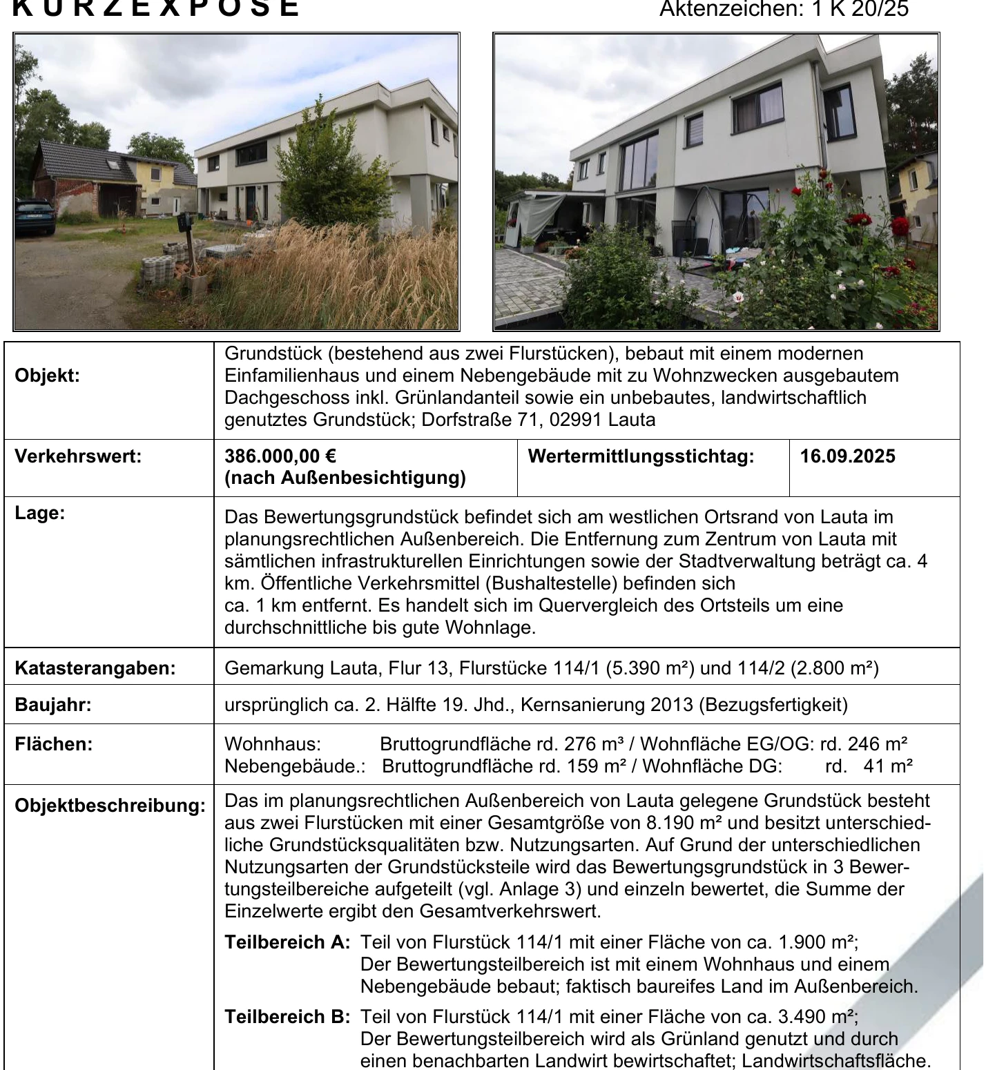 Zwangsversteigerung: Einfamilienhaus in Dorfstraße 71, 02991 Lauta mit einem Verkehrswert von 386.000 €. Versteigerungstermin am 27.03.2026 am Amtsgericht Amtsgericht Bautzen, 287 m² Wohnfläche, 8.190 m² Grundstück. Inklusive KI-gestützter Gutachtenanalyse mit Investitions-Score und Mängelbewertung.