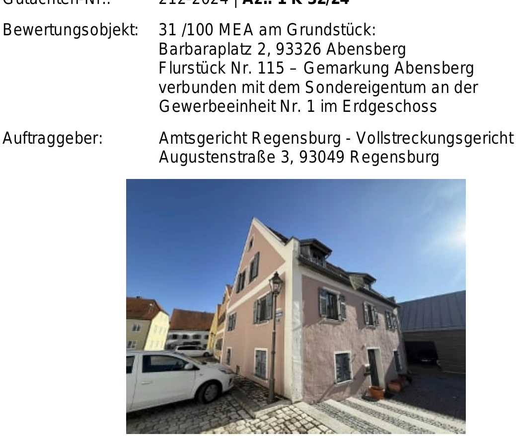 Zwangsversteigerung: Wohn- und Geschäftshaus in Barbaraplatz 2, 93326 Abensberg mit einem Verkehrswert von 93.000 €. Versteigerungstermin am 10.04.2026 am Amtsgericht Amtsgericht Regensburg, 114 m² Grundstück. Inklusive KI-gestützter Gutachtenanalyse mit Investitions-Score und Mängelbewertung.