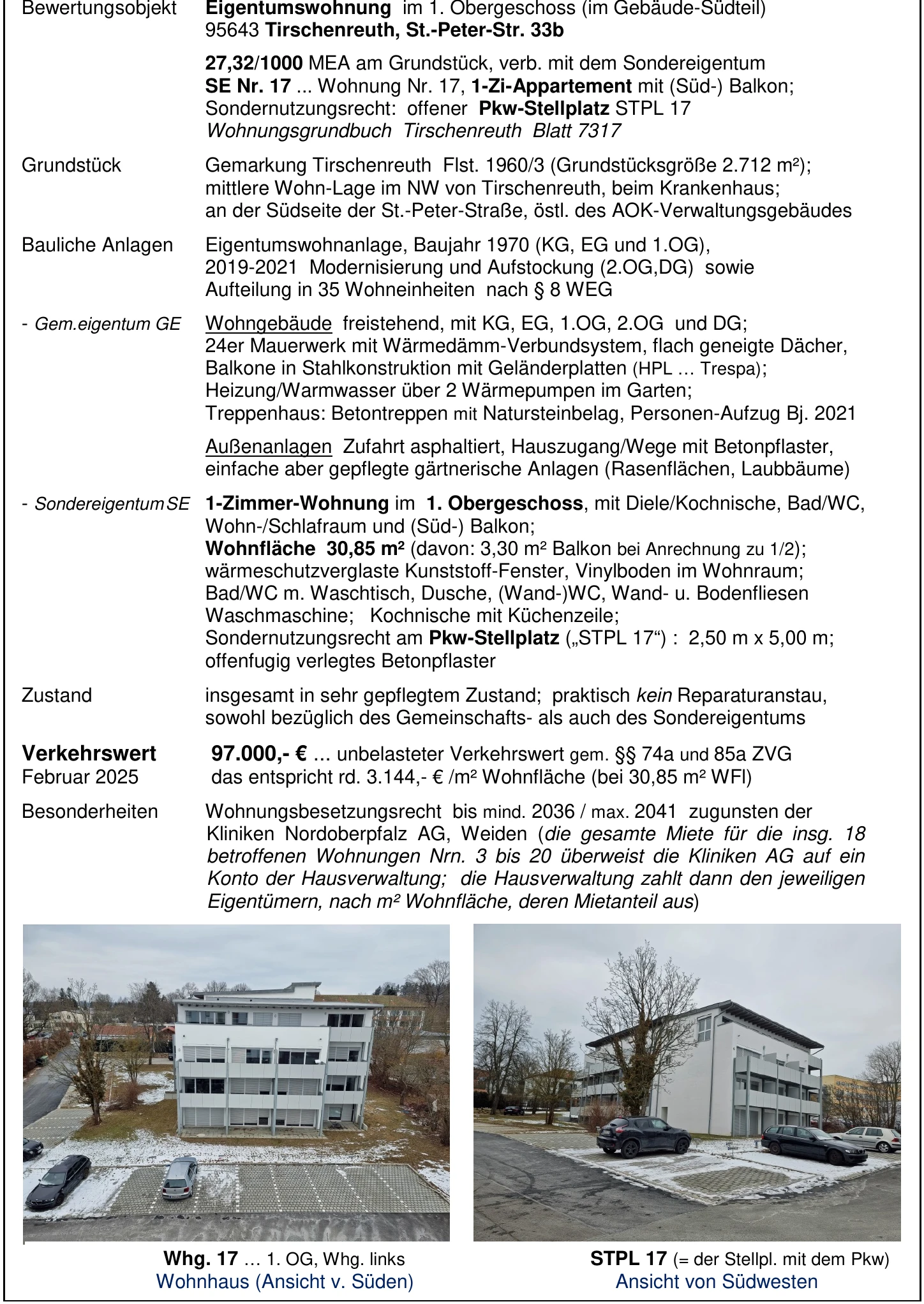 Zwangsversteigerung: 1-Zimmer-Wohnung in St.-Peter-Str. 33b, 95643 Tirschenreuth mit einem Verkehrswert von 97.000 €. Versteigerungstermin am 10.03.2026 am Amtsgericht Amtsgericht Weiden i.d.Opf., 30 m² Wohnfläche, 2.712 m² Grundstück. Inklusive KI-gestützter Gutachtenanalyse mit Investitions-Score und Mängelbewertung.