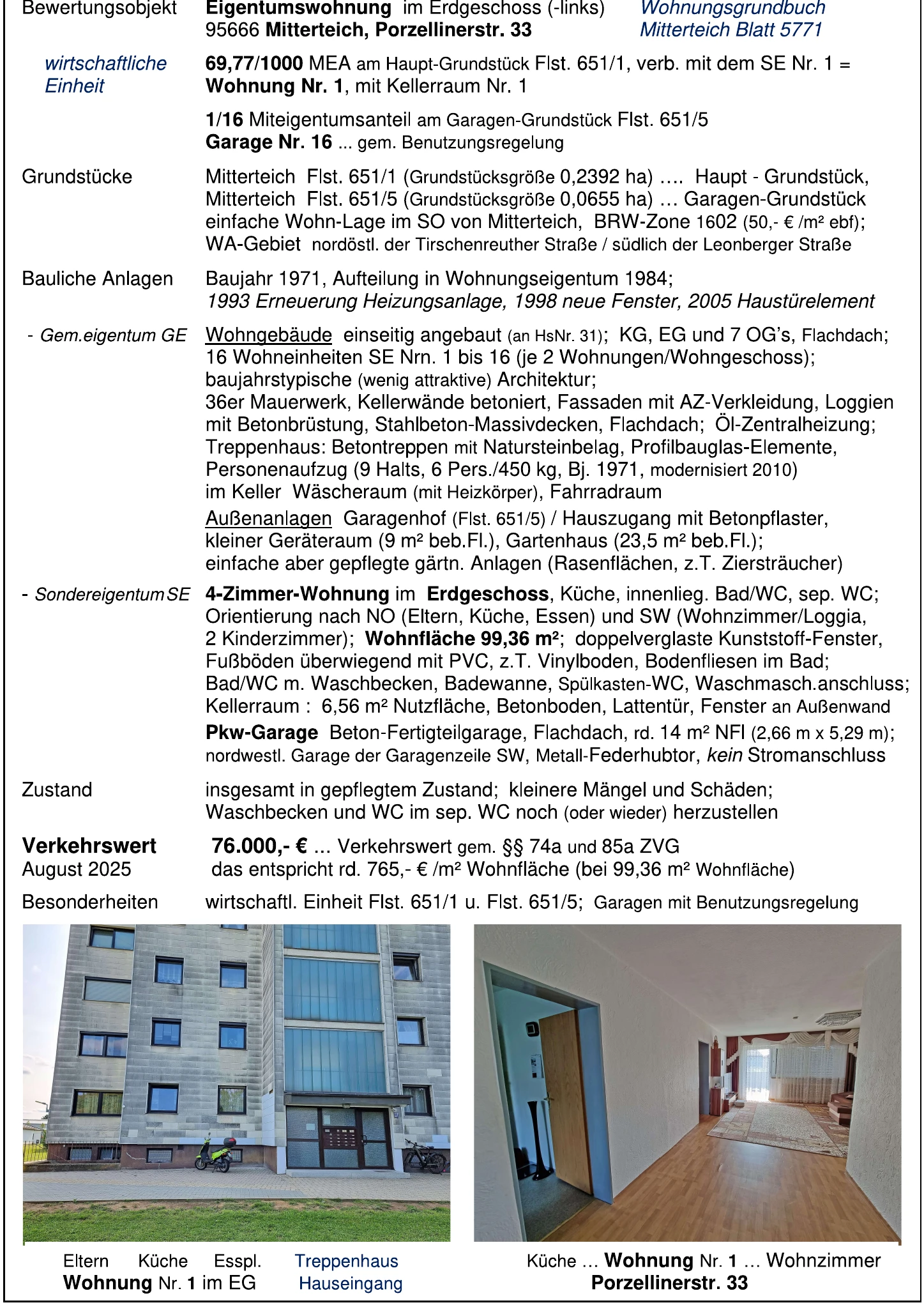 Zwangsversteigerung: 4-Zimmerwohnung mit Garagengrundstück in Porzellinerstraße 33, 95643 Tirschenreuth mit einem Verkehrswert von 76.000 €. Versteigerungstermin am 21.04.2026 am Amtsgericht Amtsgericht Weiden i.d.OPf., 99 m² Wohnfläche, 3.047 m² Grundstück. Inklusive KI-gestützter Gutachtenanalyse mit Investitions-Score und Mängelbewertung.