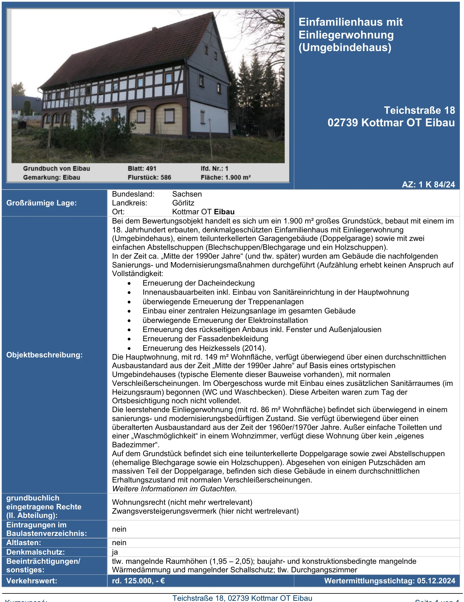 Zwangsversteigerung: Einfamilienhaus in Teichstraße 18, 02739 Kottmar, (Eibau) mit einem Verkehrswert von 125.000 €. Versteigerungstermin am 25.03.2026 am Amtsgericht Amtsgericht Görlitz, 149 m² Wohnfläche, 1.900 m² Grundstück. Inklusive KI-gestützter Gutachtenanalyse mit Investitions-Score und Mängelbewertung.