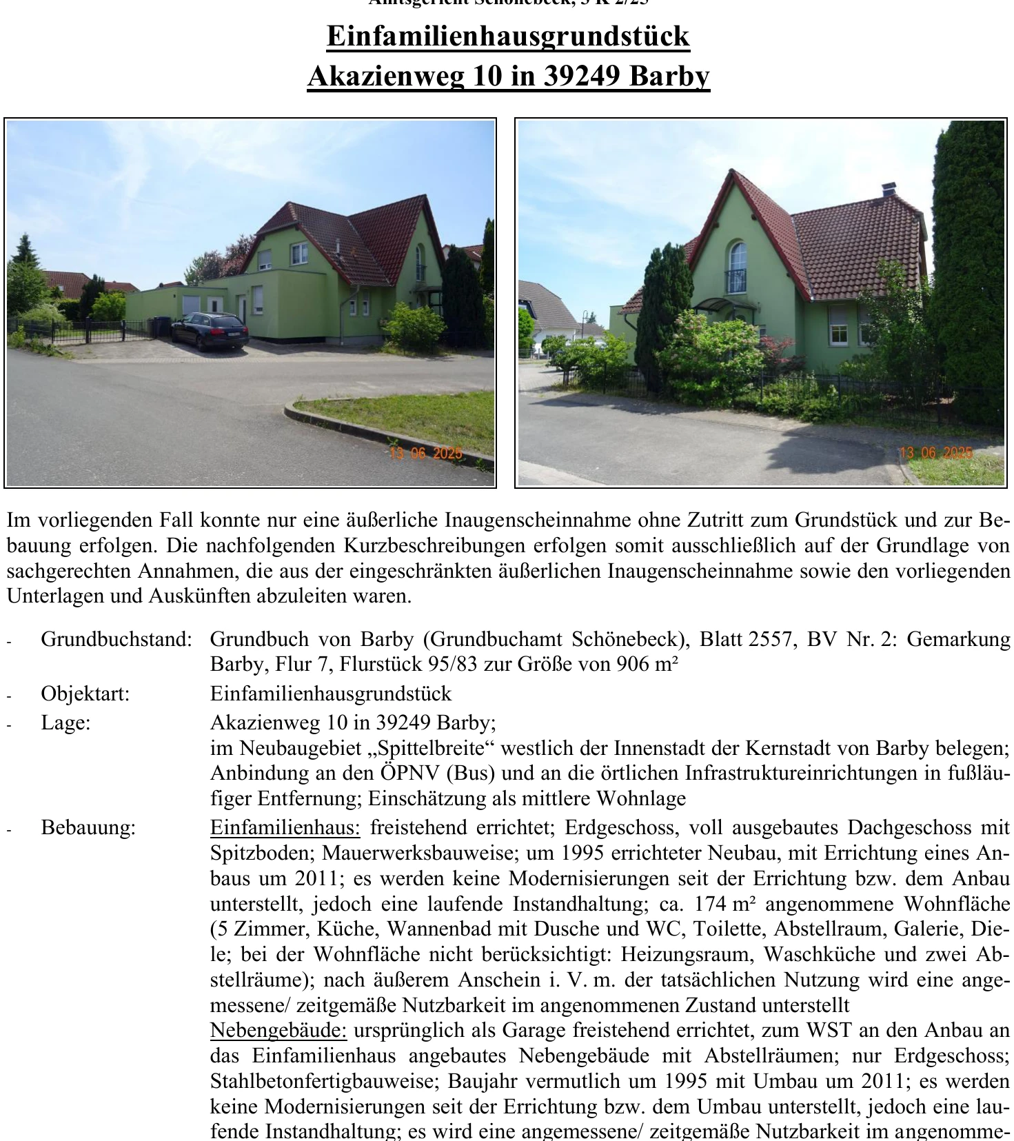 Zwangsversteigerung: Einfamilienhaus in Akazienweg 10, 39249 Barby mit einem Verkehrswert von 250.000 €. Versteigerungstermin am 28.04.2026 am Amtsgericht Amtsgericht Schönebeck, 174 m² Wohnfläche, 906 m² Grundstück. Inklusive KI-gestützter Gutachtenanalyse mit Investitions-Score und Mängelbewertung.