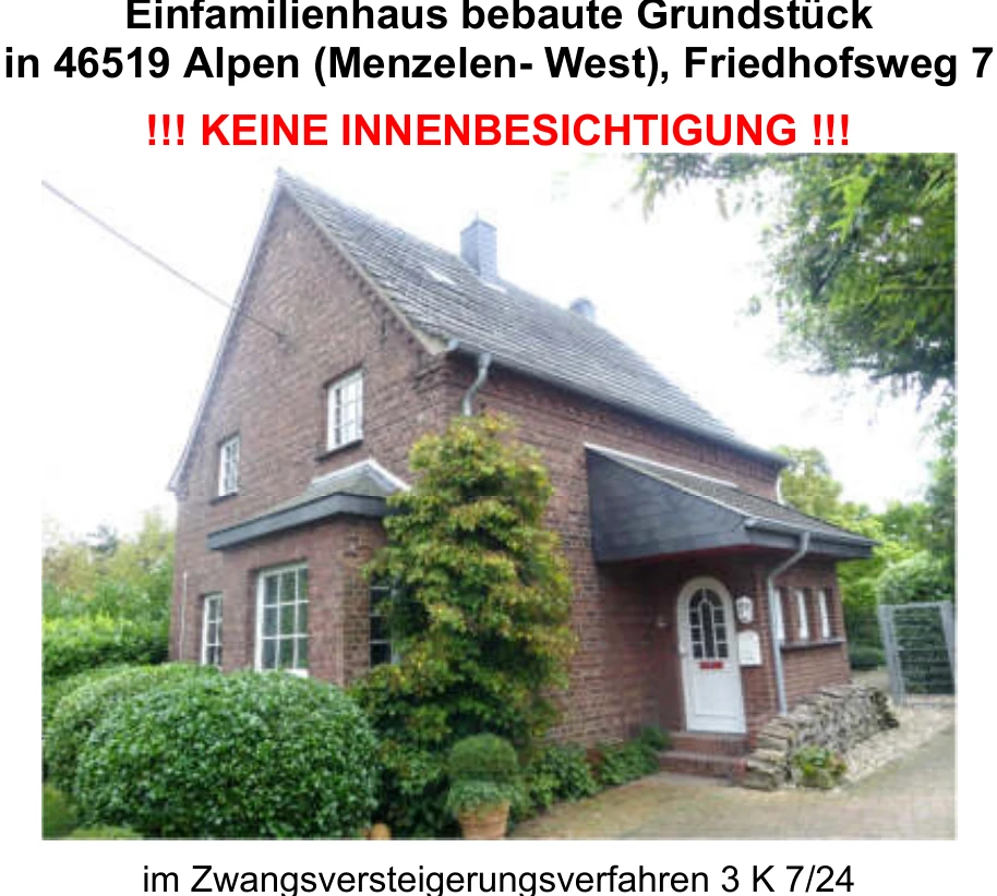 Zwangsversteigerung: Einfamilienhaus in Friedhofsweg 7, 46519 Alpen mit einem Verkehrswert von 299.000 €. Versteigerungstermin am 16.04.2026 am Amtsgericht Amtsgericht Rheinberg, 132 m² Wohnfläche, 1.595 m² Grundstück. Inklusive KI-gestützter Gutachtenanalyse mit Investitions-Score und Mängelbewertung.