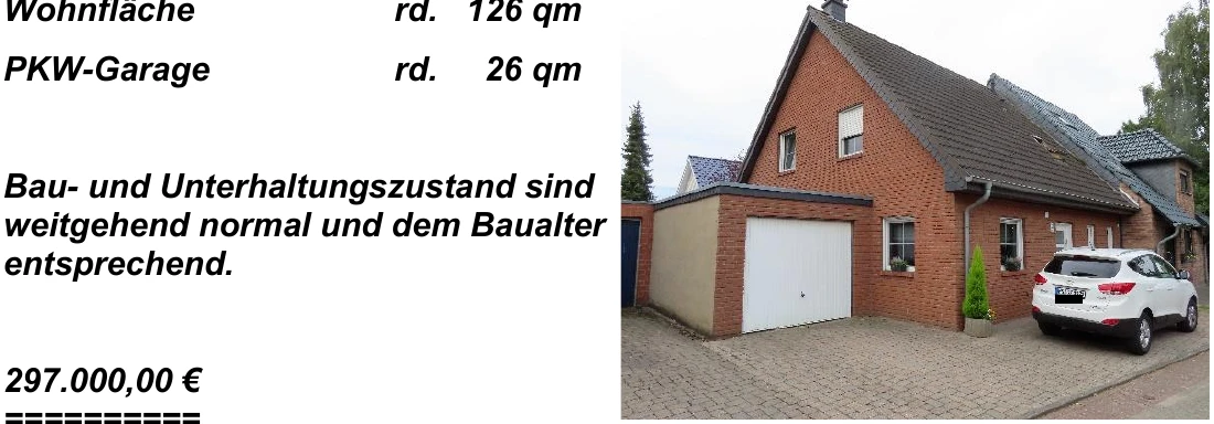 Zwangsversteigerung: Garage, Einfamilienhaus, Doppelhaushälfte in Birkenpfad 25, 41812 Erkelenz, (Schwanenberg) mit einem Verkehrswert von 301.000 €. Versteigerungstermin am 10.04.2026 am Amtsgericht Amtsgericht Erkelenz, 126 m² Wohnfläche, 326 m² Grundstück. Inklusive KI-gestützter Gutachtenanalyse mit Investitions-Score und Mängelbewertung.