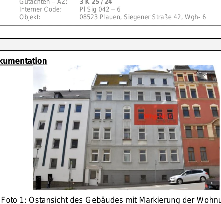 Zwangsversteigerung: Eigentumswohnung (3 bis 4 Zimmer) in Siegener Straße 42, 08523 Plauen mit einem Verkehrswert von 17.000 €. Versteigerungstermin am 22.04.2026 am Amtsgericht Amtsgericht Zwickau, 69 m² Wohnfläche, 440 m² Grundstück. Inklusive KI-gestützter Gutachtenanalyse mit Investitions-Score und Mängelbewertung.