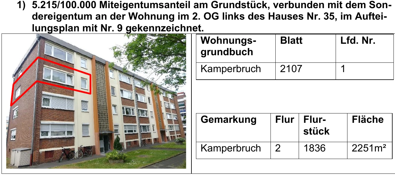 Zwangsversteigerung: Eigentumswohnung in 47475 Kamp-Lintfort mit einem Verkehrswert von 100.000 €. Versteigerungstermin am 07.05.2026 am Amtsgericht Amtsgericht Rheinberg, 59 m² Wohnfläche, 2.251 m² Grundstück. Inklusive KI-gestützter Gutachtenanalyse mit Investitions-Score und Mängelbewertung.