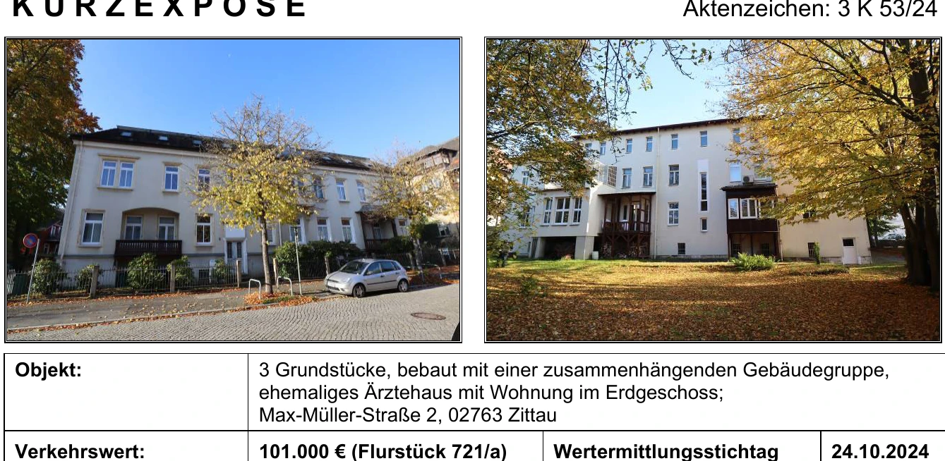 Zwangsversteigerung: Wohn-/Geschäftshaus in Max-Müller-Straße 2, 02763 Zittau mit einem Verkehrswert von 703.900 €. Versteigerungstermin am 30.03.2026 am Amtsgericht Amtsgericht Görlitz, 892 m² Wohnfläche, 1.510 m² Grundstück. Inklusive KI-gestützter Gutachtenanalyse mit Investitions-Score und Mängelbewertung.