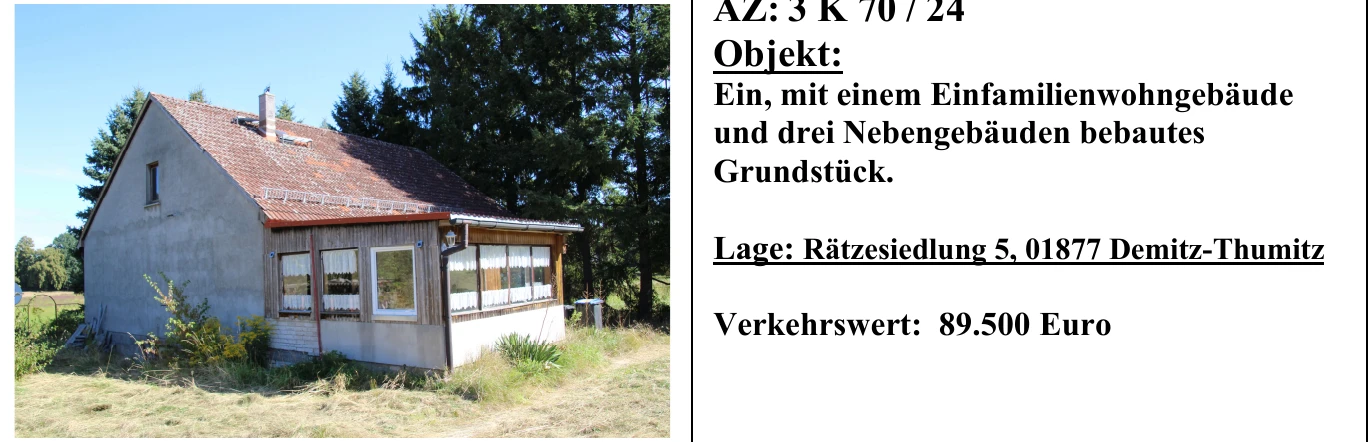 Zwangsversteigerung: Einfamilienhaus in Rätzesiedlung 5, 01877 Demitz-Thumitz mit einem Verkehrswert von 89.500 €. Versteigerungstermin am 22.05.2026 am Amtsgericht Amtsgericht Bautzen, 96 m² Wohnfläche, 2.389 m² Grundstück. Inklusive KI-gestützter Gutachtenanalyse mit Investitions-Score und Mängelbewertung.