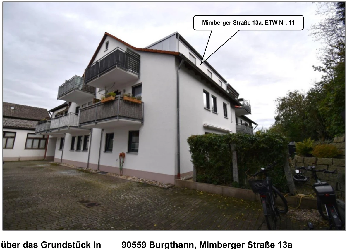 Zwangsversteigerung: Eigentumswohnung (3 bis 4 Zimmer), Garage in Mimberger Straße 13a, 90559 Burgthann mit einem Verkehrswert von 199.000 €. Versteigerungstermin am 26.03.2026 am Amtsgericht Amtsgericht Nürnberg, 64 m² Wohnfläche, 1.243 m² Grundstück. Inklusive KI-gestützter Gutachtenanalyse mit Investitions-Score und Mängelbewertung.