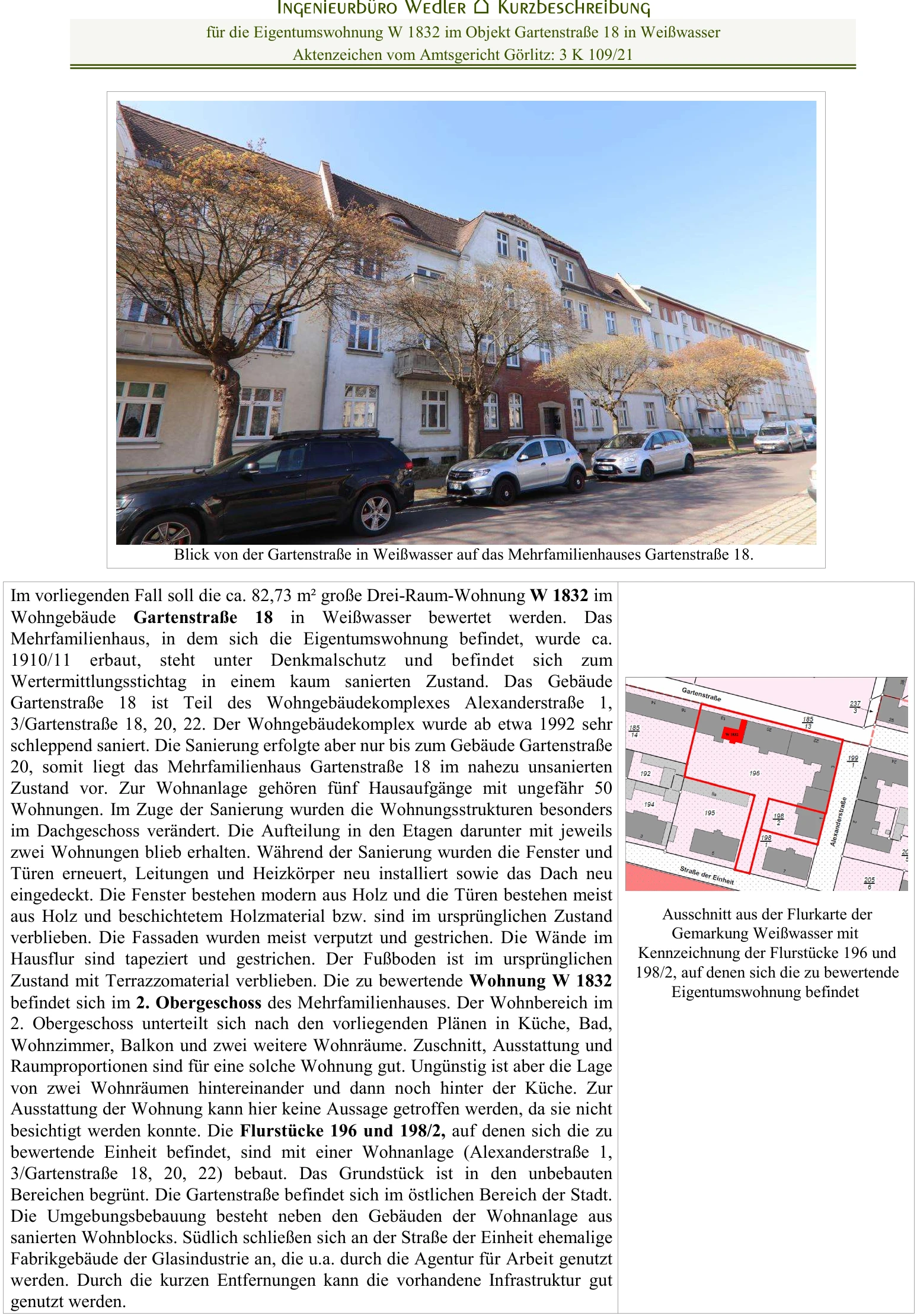Zwangsversteigerung: Eigentumswohnung (3 bis 4 Zimmer) in Gartenstraße 18, 02943 Weißwasser /O.L. mit einem Verkehrswert von 12.000 €. Versteigerungstermin am 30.03.2026 am Amtsgericht Amtsgericht Görlitz, 83 m² Wohnfläche, 4.108 m² Grundstück. Inklusive KI-gestützter Gutachtenanalyse mit Investitions-Score und Mängelbewertung.