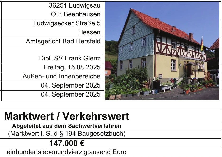 Zwangsversteigerung: Einfamilienhaus in Ludwigsecker Straße 5, 36251 Ludwigsau, (Beenhausen) mit einem Verkehrswert von 147.000 €. Versteigerungstermin am 10.06.2026 am Amtsgericht Amtsgericht Bad Hersfeld, 225 m² Wohnfläche, 6.888 m² Grundstück. Inklusive KI-gestützter Gutachtenanalyse mit Investitions-Score und Mängelbewertung.