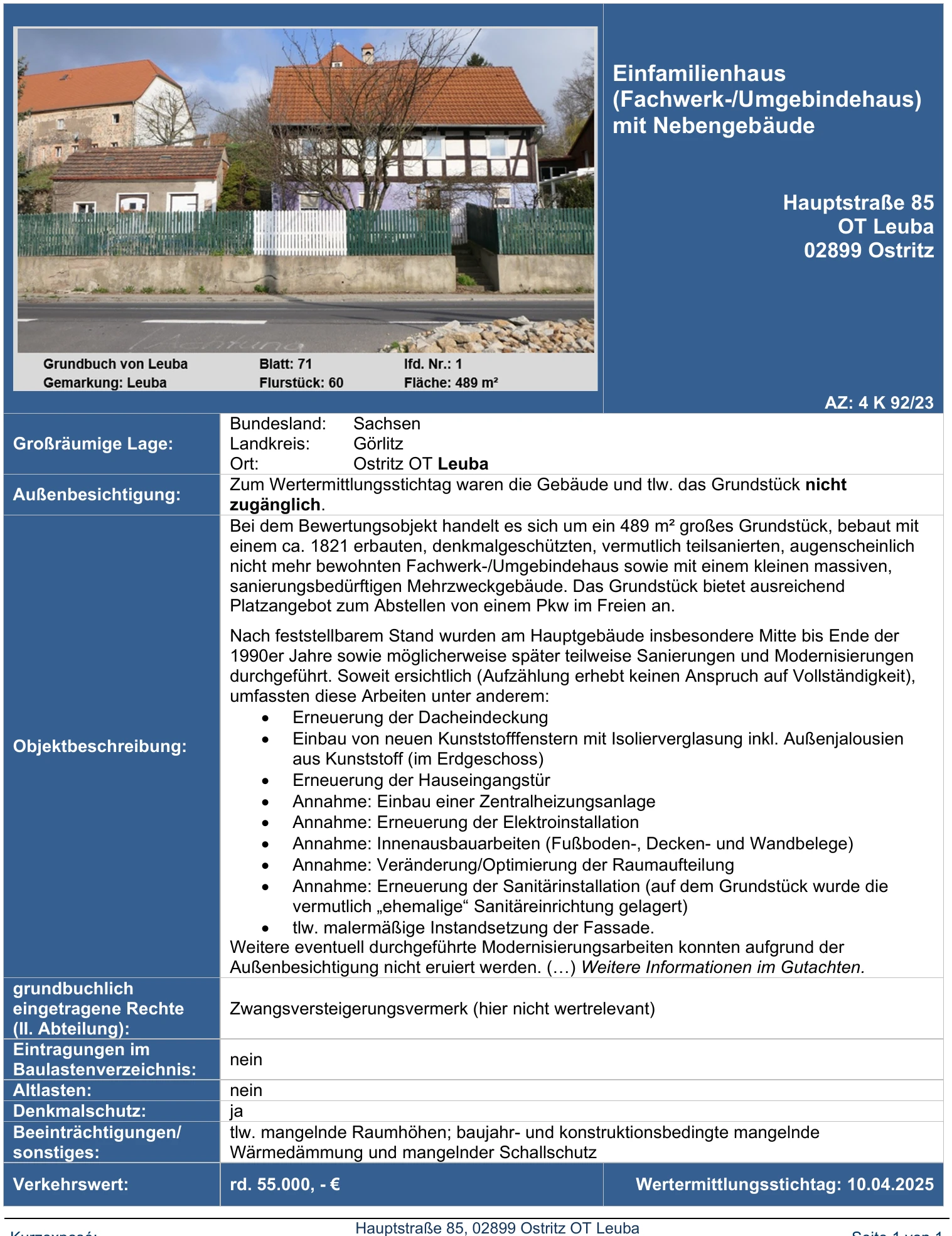 Zwangsversteigerung: Einfamilienhaus in Hauptstraße 85, 02899 Ostritz mit einem Verkehrswert von 55.000 €. Versteigerungstermin am 24.03.2026 am Amtsgericht Amtsgericht Görlitz, 100 m² Wohnfläche, 489 m² Grundstück. Inklusive KI-gestützter Gutachtenanalyse mit Investitions-Score und Mängelbewertung.