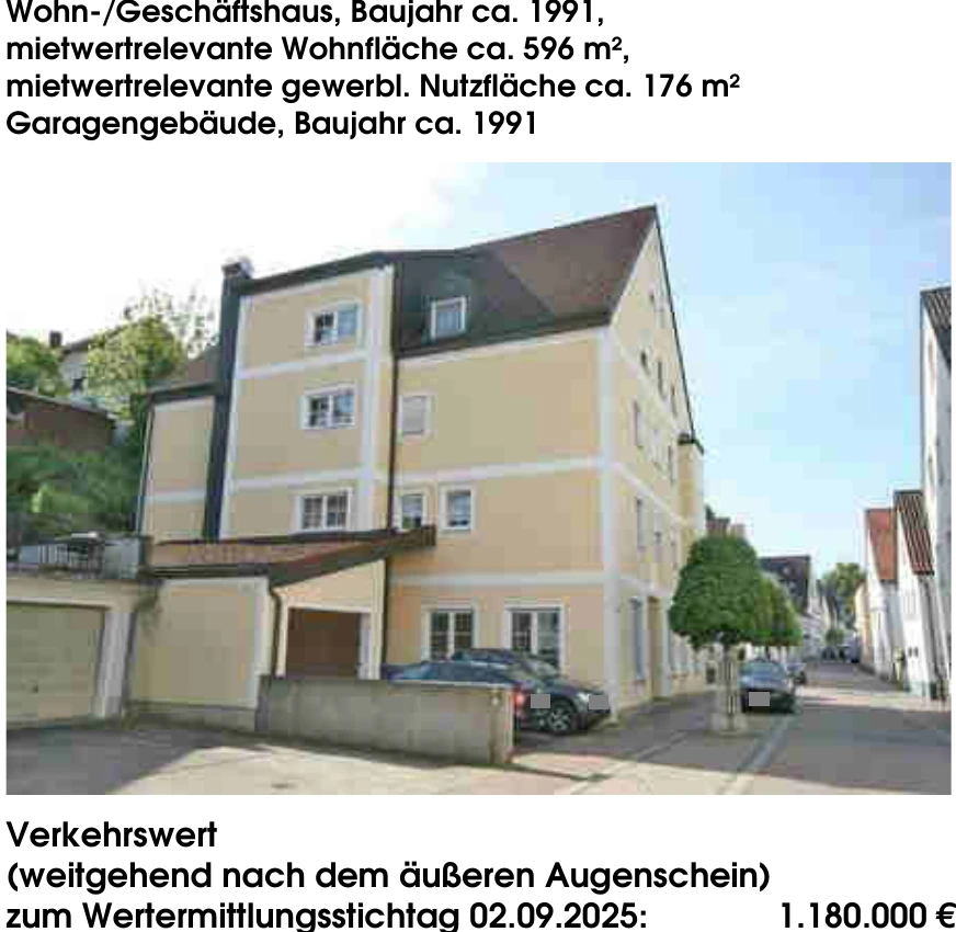 Zwangsversteigerung: Wohn-/Geschäftshaus in Kochstraße 5, 93077 Bad Abbach mit einem Verkehrswert von 1.180.000 €. Versteigerungstermin am 16.04.2026 am Amtsgericht Amtsgericht Regensburg, 596 m² Wohnfläche, 564 m² Grundstück. Inklusive KI-gestützter Gutachtenanalyse mit Investitions-Score und Mängelbewertung.