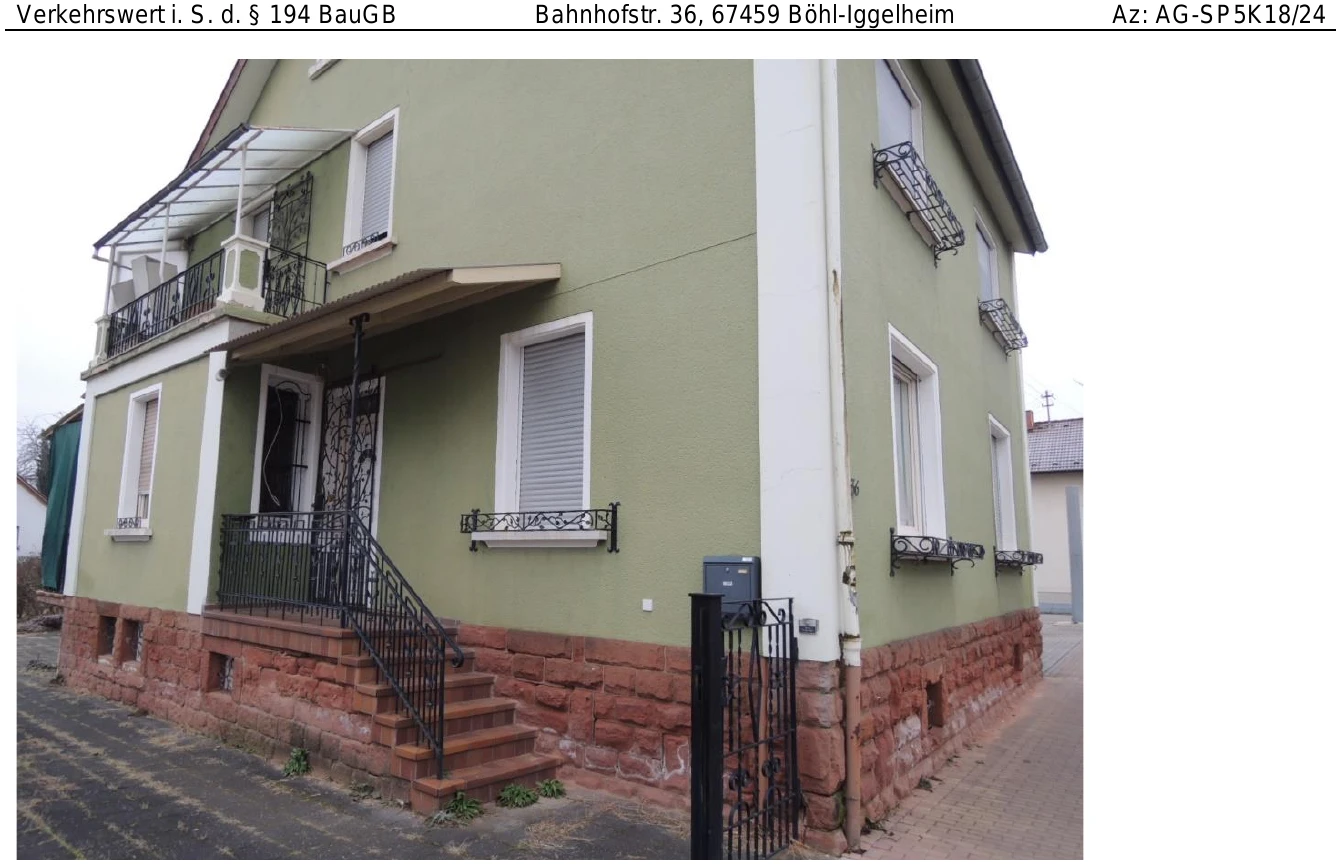 Zwangsversteigerung: Einfamilienhaus in Bahnhofstraße 36, 67459 Böhl-Iggelheim mit einem Verkehrswert von 375.000 €. Versteigerungstermin am 29.05.2026 am Amtsgericht Amtsgericht Speyer, 168 m² Wohnfläche, 446 m² Grundstück. Inklusive KI-gestützter Gutachtenanalyse mit Investitions-Score und Mängelbewertung.
