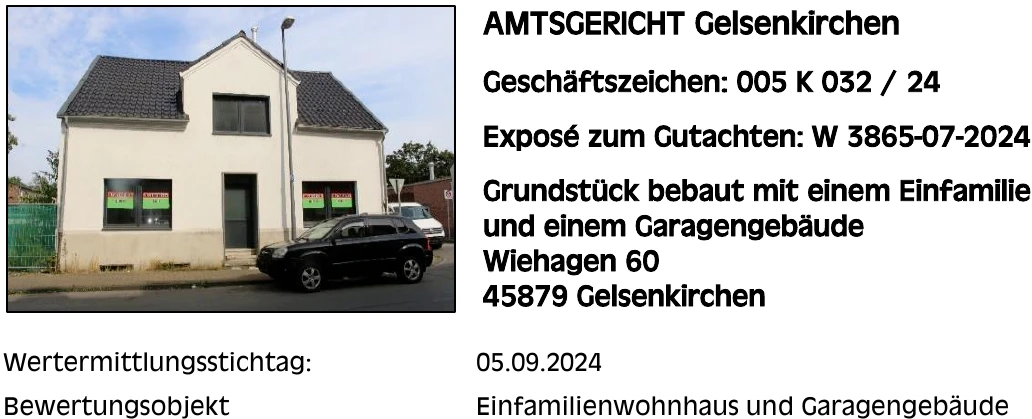 Zwangsversteigerung: Einfamilienhaus, Garagengebäude in Wiehagen 60, 45879 Gelsenkirchen mit einem Verkehrswert von 145.000 €. Versteigerungstermin am 03.06.2026 am Amtsgericht Amtsgericht Gelsenkirchen, 129 m² Wohnfläche, 205 m² Grundstück. Inklusive KI-gestützter Gutachtenanalyse mit Investitions-Score und Mängelbewertung.