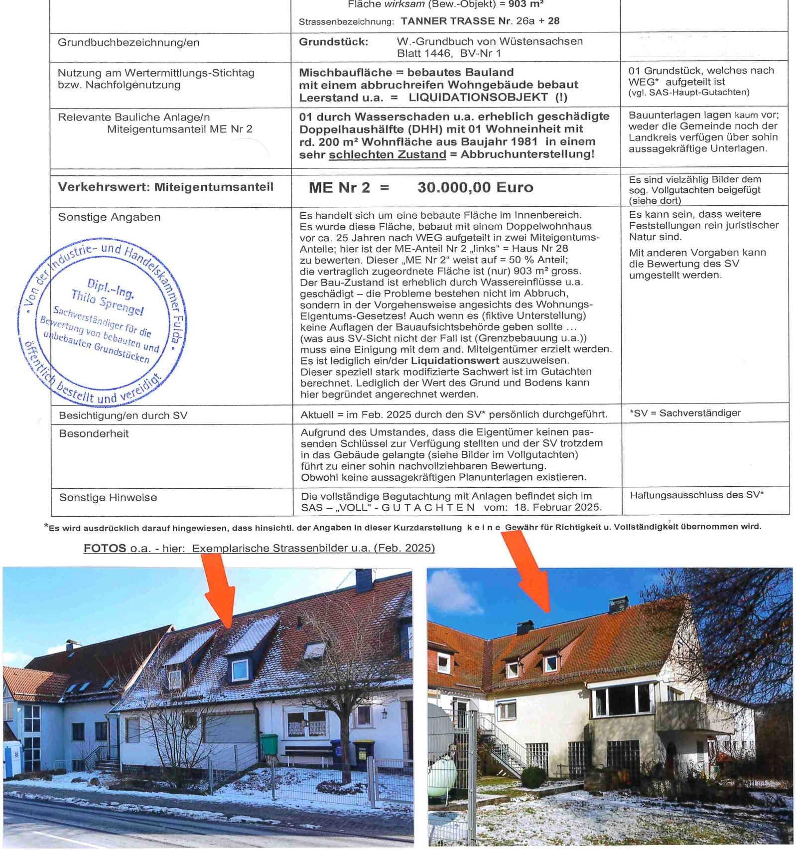 Zwangsversteigerung: Einfamilienhaus in Tanner Straße 26a und 28, 36114 Ehrenberg, (Wüstensachsen) mit einem Verkehrswert von 30.000 €. Versteigerungstermin am 06.03.2026 am Amtsgericht Amtsgericht Fulda, 200 m² Wohnfläche, 903 m² Grundstück. Inklusive KI-gestützter Gutachtenanalyse mit Investitions-Score und Mängelbewertung.