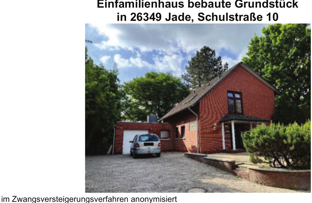 Zwangsversteigerung: Zweifamilienhaus in Schulstraße 10, 26349 Jade mit einem Verkehrswert von 202.000 €. Versteigerungstermin am 13.03.2026 am Amtsgericht Amtsgericht Brake, 125 m² Wohnfläche, 981 m² Grundstück. Inklusive KI-gestützter Gutachtenanalyse mit Investitions-Score und Mängelbewertung.