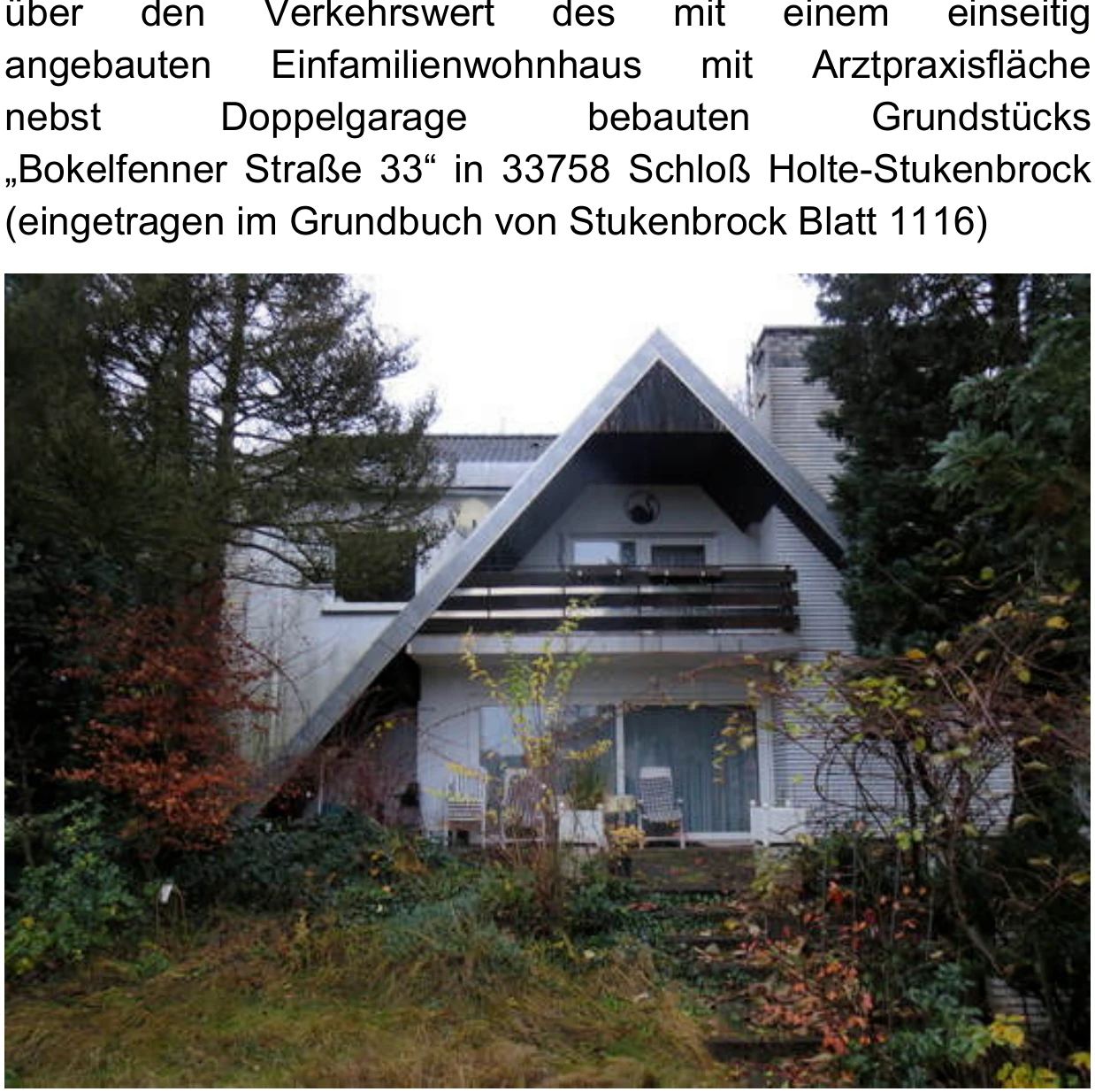 Zwangsversteigerung: Einfamilienhaus mit Praxisräumen in Bokelfenner-Straße 33 mit einem Verkehrswert von 400.000 €. Versteigerungstermin am 23.04.2026 am Amtsgericht Amtsgericht Bielefeld, 202 m² Wohnfläche, 887 m² Grundstück. Inklusive KI-gestützter Gutachtenanalyse mit Investitions-Score und Mängelbewertung.