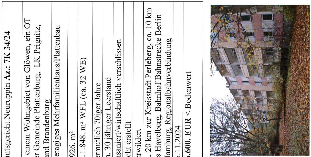 Zwangsversteigerung: Mehrfamilienhaus in Waldeck 19, 20, 21, 22, 19339 Plattenburg, (Glöwen) mit einem Verkehrswert von 36.600 €. Versteigerungstermin am 06.05.2026 am Amtsgericht Amtsgericht Neuruppin. Inklusive KI-gestützter Gutachtenanalyse mit Investitions-Score und Mängelbewertung.