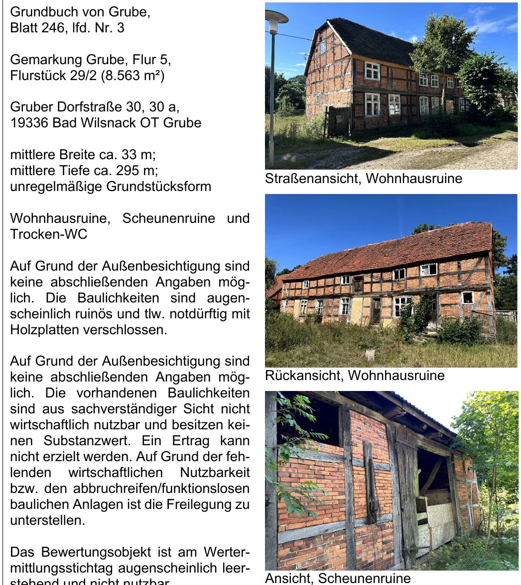 Zwangsversteigerung: Sonstiges in Grubener Dorfstraße 30, 30a, 16336 Bad Wilsnack, (Grube) mit einem Verkehrswert von 1 €. Versteigerungstermin am 17.04.2026 am Amtsgericht Amtsgericht Neuruppin, 8.563 m² Grundstück. Inklusive KI-gestützter Gutachtenanalyse mit Investitions-Score und Mängelbewertung.