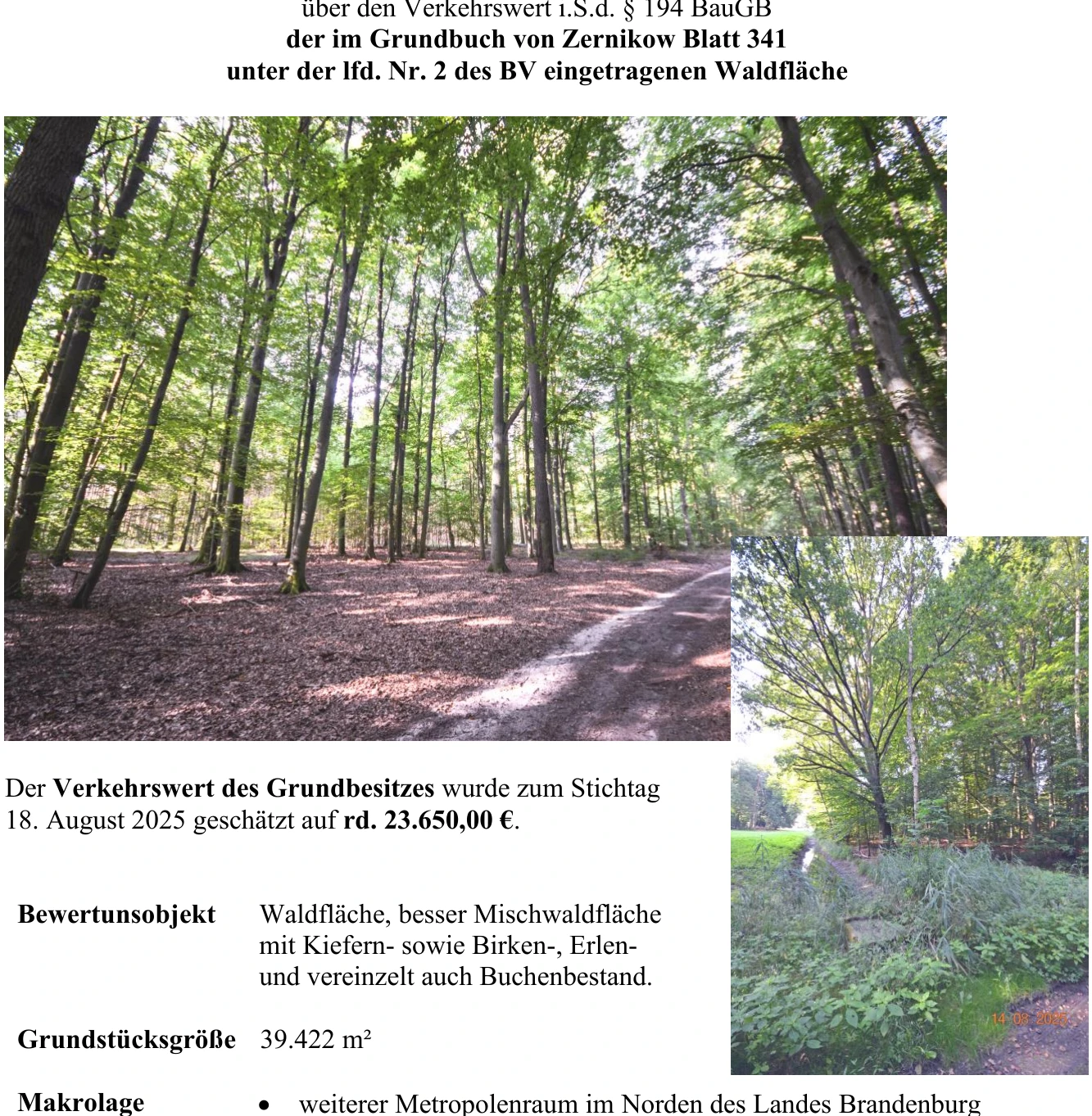 Zwangsversteigerung: land- und forstwirtschaftlich genutztes Grundstück in 16775 Zernikow mit einem Verkehrswert von 23.650 €. Versteigerungstermin am 03.03.2026 am Amtsgericht Amtsgericht Neuruppin, 39.422 m² Grundstück. Inklusive KI-gestützter Gutachtenanalyse mit Investitions-Score und Mängelbewertung.