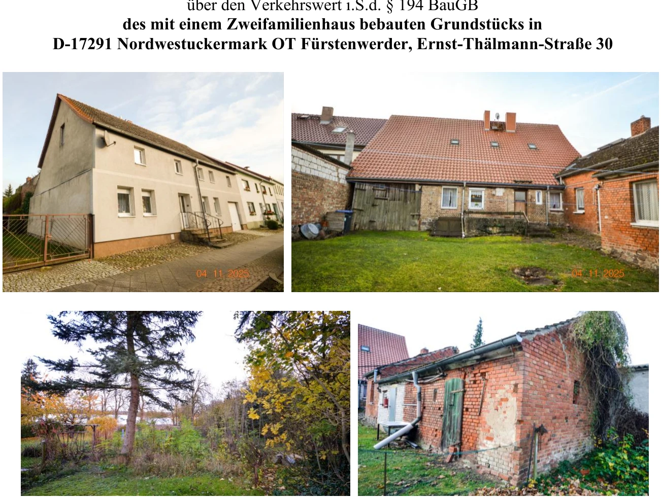 Zwangsversteigerung: Zweifamilienhaus in Ernst-Thälmann-Straße 30, 17291 Nordwestuckermark, (Fürstenwerder) mit einem Verkehrswert von 54.000 €. Versteigerungstermin am 28.04.2026 am Amtsgericht Amtsgericht Neuruppin, 146 m² Wohnfläche, 1.257 m² Grundstück. Inklusive KI-gestützter Gutachtenanalyse mit Investitions-Score und Mängelbewertung.