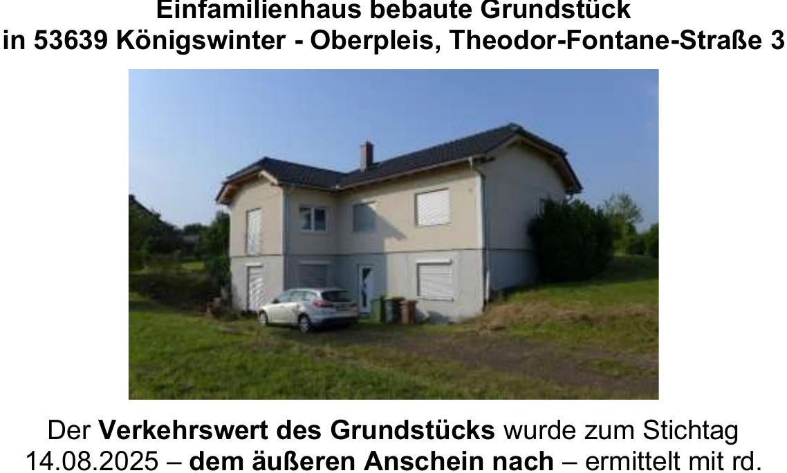 Zwangsversteigerung: Einfamilienhaus in Theodor-Fontane-Straße 3, 53639 Königswinter, (Oberpleis) mit einem Verkehrswert von 1.460.000 €. Versteigerungstermin am 21.04.2026 am Amtsgericht Amtsgericht Königswinter, 111 m² Wohnfläche, 2.776 m² Grundstück. Inklusive KI-gestützter Gutachtenanalyse mit Investitions-Score und Mängelbewertung.