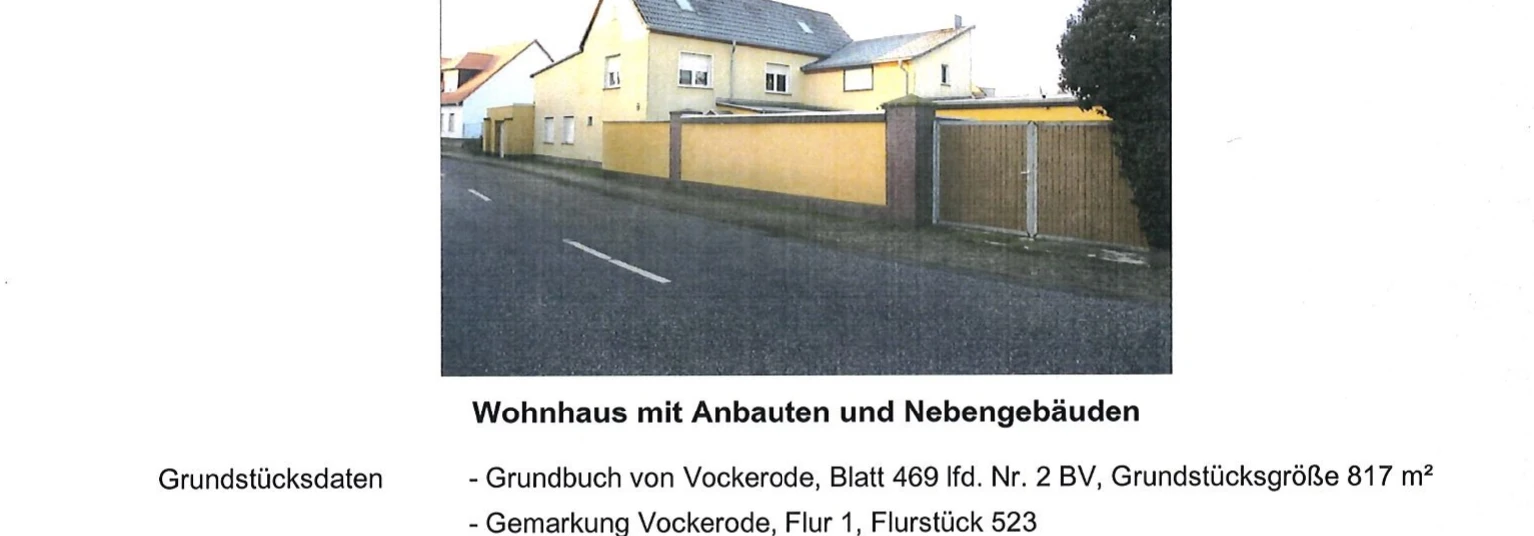 Zwangsversteigerung: Wohnhaus mit Anbauten und Nebengebäuden in Griesener Str. 1, 06785 Oranienbaum-Wörlitz, (Vockerode) mit einem Verkehrswert von 110.000 €. Versteigerungstermin am 09.04.2026 am Amtsgericht Amtsgericht Zerbst, 196 m² Wohnfläche, 817 m² Grundstück. Inklusive KI-gestützter Gutachtenanalyse mit Investitions-Score und Mängelbewertung.