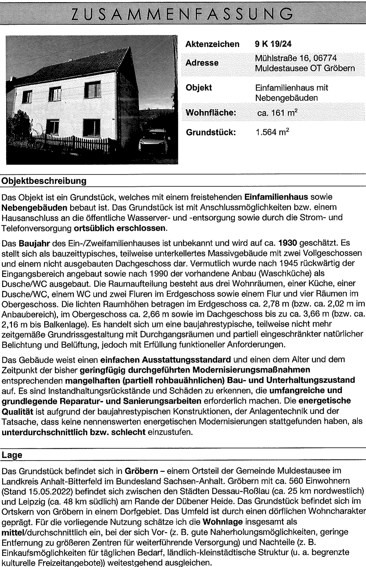 Zwangsversteigerung: Einfamilienhaus, mit Nebengebäuden in Mu(e)hlstr. 16, 06774 Gemeinde Muldestausee, (Gröbern) mit einem Verkehrswert von 55.000 €. Versteigerungstermin am 02.03.2026 am Amtsgericht Amtsgericht Bitterfeld-Wolfen, 1.564 m² Grundstück. Inklusive KI-gestützter Gutachtenanalyse mit Investitions-Score und Mängelbewertung.