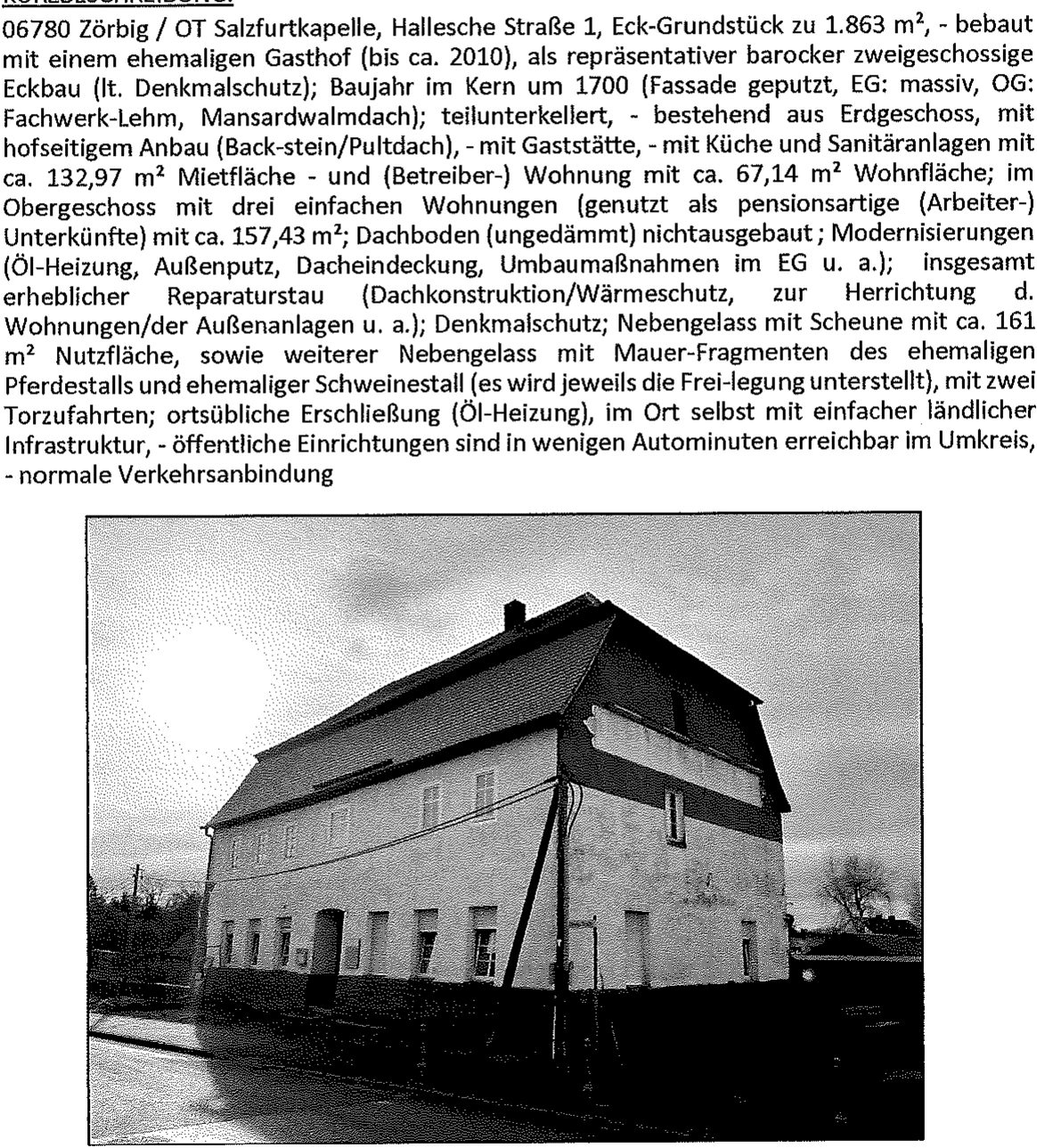 Zwangsversteigerung: ehemaliger Gasthof in Hallesche Straße 1, 06780 Stadt Zörbig, (Salzfurtkapelle) mit einem Verkehrswert von 97.400 €. Versteigerungstermin am 01.06.2026 am Amtsgericht Amtsgericht Bitterfeld-Wolfen, 157 m² Wohnfläche, 1.863 m² Grundstück. Inklusive KI-gestützter Gutachtenanalyse mit Investitions-Score und Mängelbewertung.