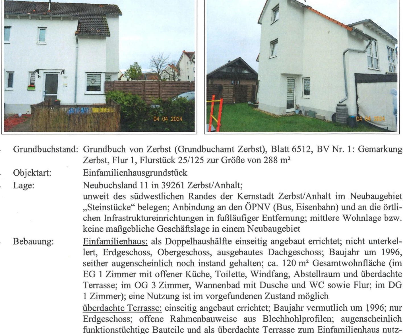 Zwangsversteigerung: Einfamilienhaus in Neubuchsland 11, 39261 Zerbst/Anhalt mit einem Verkehrswert von 170.000 €. Versteigerungstermin am 16.04.2026 am Amtsgericht Amtsgericht Zerbst, 120 m² Wohnfläche, 288 m² Grundstück. Inklusive KI-gestützter Gutachtenanalyse mit Investitions-Score und Mängelbewertung.