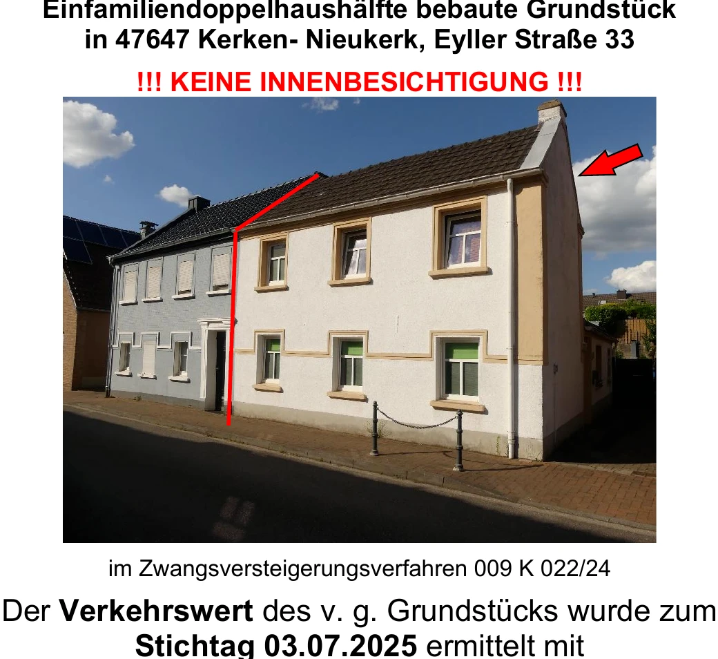 Zwangsversteigerung: Einfamilienhaus in Eyller Str. 33, 47647 Kerken, (Nieukerk) mit einem Verkehrswert von 174.000 €. Versteigerungstermin am 16.06.2026 am Amtsgericht Amtsgericht Geldern, 131 m² Wohnfläche, 367 m² Grundstück. Inklusive KI-gestützter Gutachtenanalyse mit Investitions-Score und Mängelbewertung.