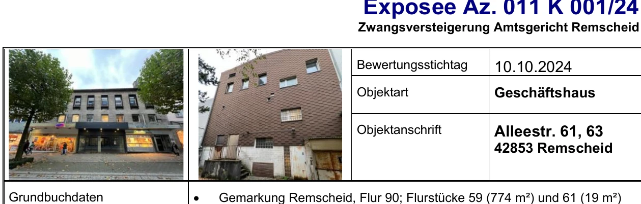 Zwangsversteigerung: Geschäftshaus in Alleestr. 61, 63, 42853 Remscheid mit einem Verkehrswert von 75.597 €. Versteigerungstermin am 13.05.2026 am Amtsgericht Amtsgericht Remscheid, 793 m² Grundstück. Inklusive KI-gestützter Gutachtenanalyse mit Investitions-Score und Mängelbewertung.