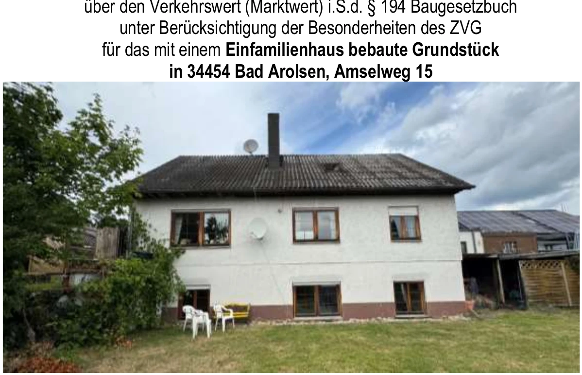 Zwangsversteigerung: Einfamilienhaus in Amselweg 15, 34454 Bad Arolsen, (Mengeringhausen) mit einem Verkehrswert von 176.000 €. Versteigerungstermin am 17.04.2026 am Amtsgericht Amtsgericht Korbach, 123 m² Wohnfläche, 807 m² Grundstück. Inklusive KI-gestützter Gutachtenanalyse mit Investitions-Score und Mängelbewertung.