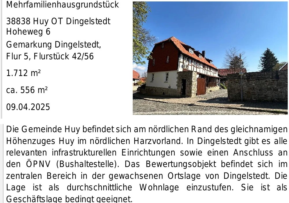 Zwangsversteigerung: Mehrfamilienhaus in Hoheweg 6, 38838 Huy, (Dingelstedt) mit einem Verkehrswert von 280.000 €. Versteigerungstermin am 05.05.2026 am Amtsgericht Amtsgericht Halberstadt, 556 m² Wohnfläche, 1.712 m² Grundstück. Inklusive KI-gestützter Gutachtenanalyse mit Investitions-Score und Mängelbewertung.