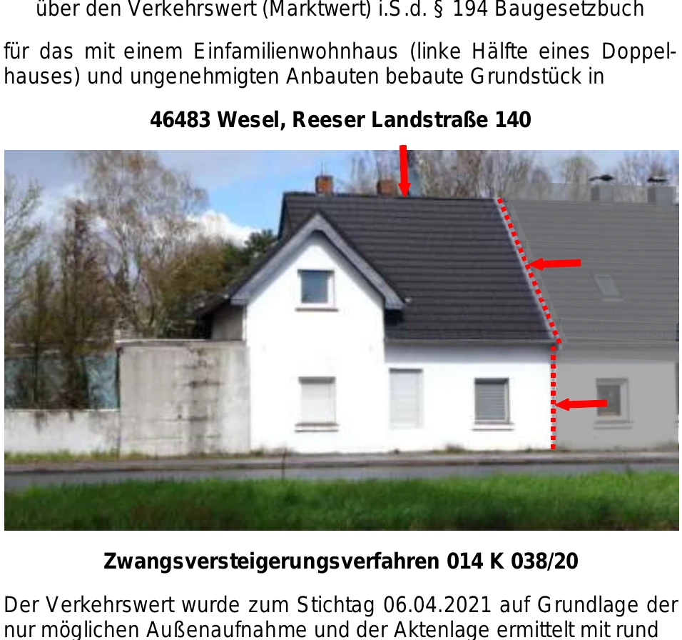 Zwangsversteigerung: Doppelhaushälfte mit ungenehmigten Anbauten in Reeser Landstraße 140, 46483 Wesel mit einem Verkehrswert von 151.000 €. Versteigerungstermin am 30.03.2026 am Amtsgericht Amtsgericht Wesel, 100 m² Wohnfläche, 1.803 m² Grundstück. Inklusive KI-gestützter Gutachtenanalyse mit Investitions-Score und Mängelbewertung.