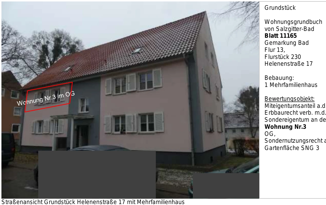 Zwangsversteigerung: Sonstiges, Anteil an dem Erbbaurecht für 3-Zimmer-Wohnung in Helenenstraße 17, 38259 Salzgitter, (Bad) mit einem Verkehrswert von 56.000 €. Versteigerungstermin am 20.03.2026 am Amtsgericht Amtsgericht Salzgitter, 59 m² Wohnfläche, 1.206 m² Grundstück. Inklusive KI-gestützter Gutachtenanalyse mit Investitions-Score und Mängelbewertung.