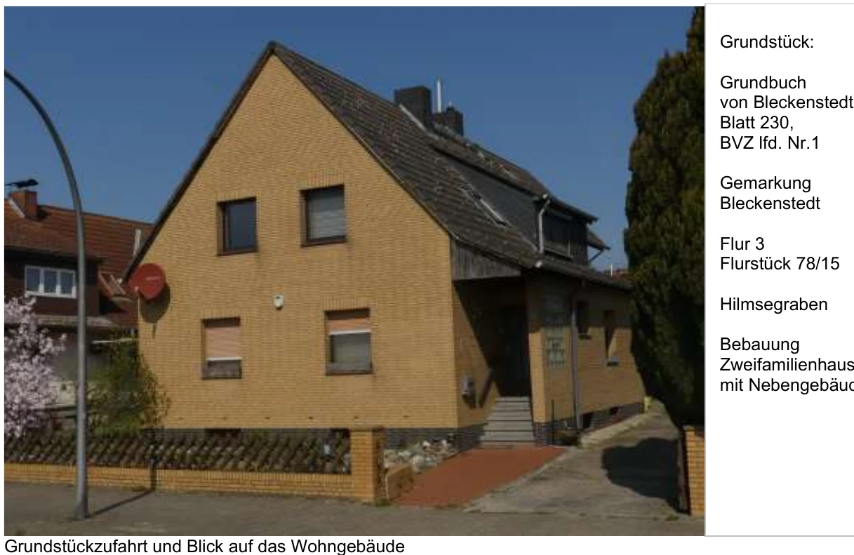 Zwangsversteigerung: Einfamilienhaus in Hilmsegraben 11, 38239 Salzgitter, (Bleckenstedt) mit einem Verkehrswert von 258.200 €. Versteigerungstermin am 27.03.2026 am Amtsgericht Amtsgericht Salzgitter, 189 m² Wohnfläche, 1.000 m² Grundstück. Inklusive KI-gestützter Gutachtenanalyse mit Investitions-Score und Mängelbewertung.