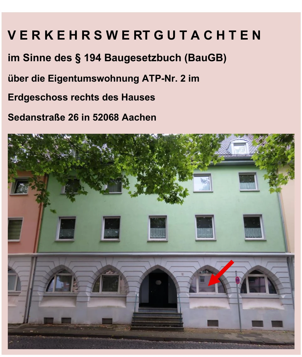 Zwangsversteigerung: Eigentumswohnung (1 bis 2 Zimmer) in Sedanstraße 26, 52068 Aachen mit einem Verkehrswert von 102.000 €. Versteigerungstermin am 11.06.2026 am Amtsgericht Amtsgericht Aachen, 52 m² Wohnfläche, 407 m² Grundstück. Inklusive KI-gestützter Gutachtenanalyse mit Investitions-Score und Mängelbewertung.