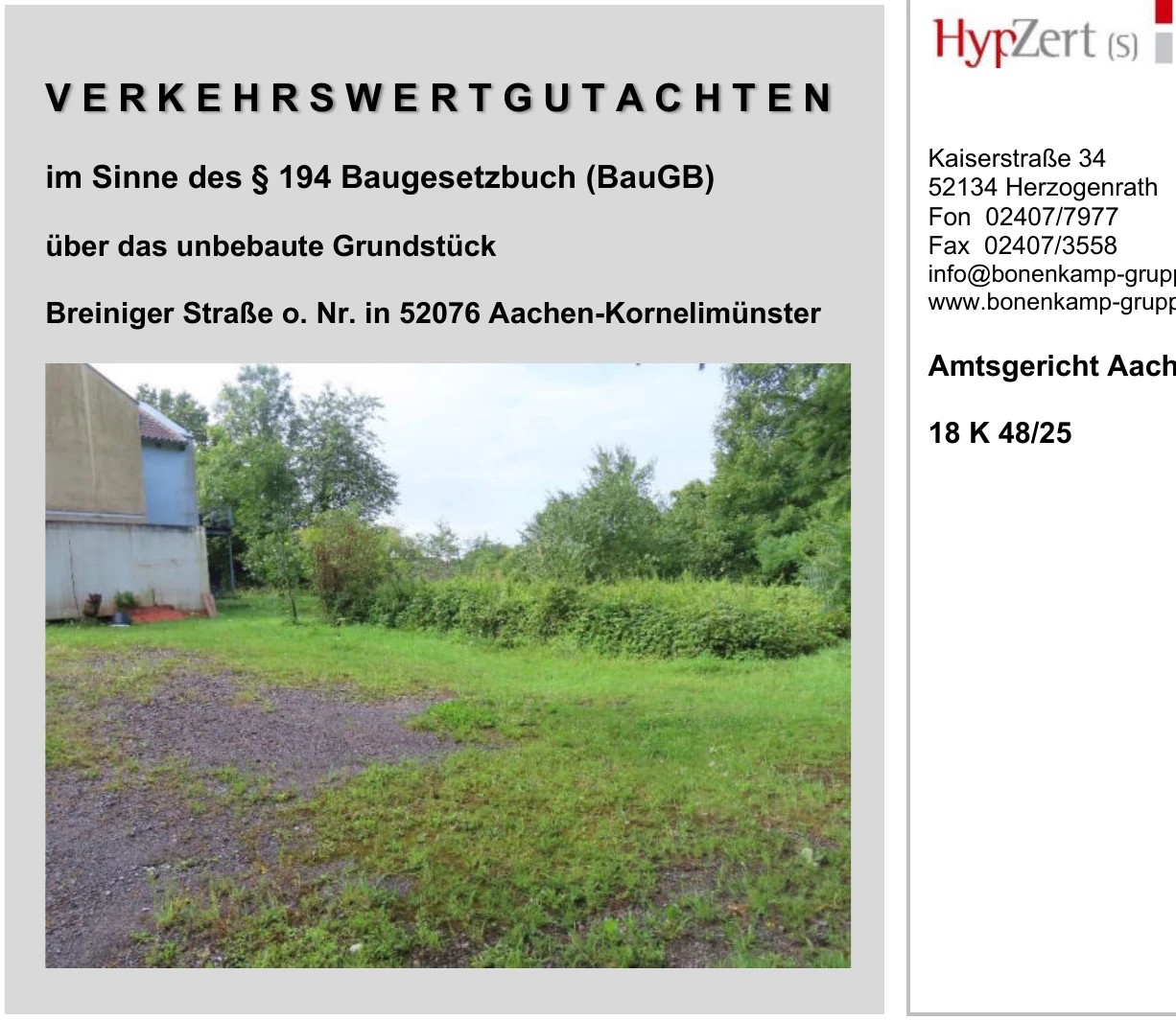 Zwangsversteigerung: unbebautes Grundstück in Breiniger Straße, 52076 Aachen, (Kornelimünster) mit einem Verkehrswert von 28.000 €. Versteigerungstermin am 17.03.2026 am Amtsgericht Amtsgericht Aachen, 713 m² Grundstück. Inklusive KI-gestützter Gutachtenanalyse mit Investitions-Score und Mängelbewertung.