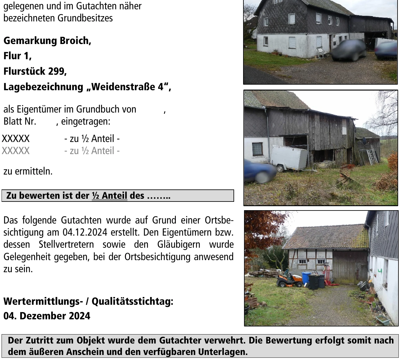 Zwangsversteigerung: Wohnhaus mit Nebengebäuden in Weidenstraße 4, 53937 Schleiden mit einem Verkehrswert von 80.600 €. Versteigerungstermin am 13.07.2026 am Amtsgericht Amtsgericht Schleiden, 110 m² Wohnfläche, 1.994 m² Grundstück. Inklusive KI-gestützter Gutachtenanalyse mit Investitions-Score und Mängelbewertung.