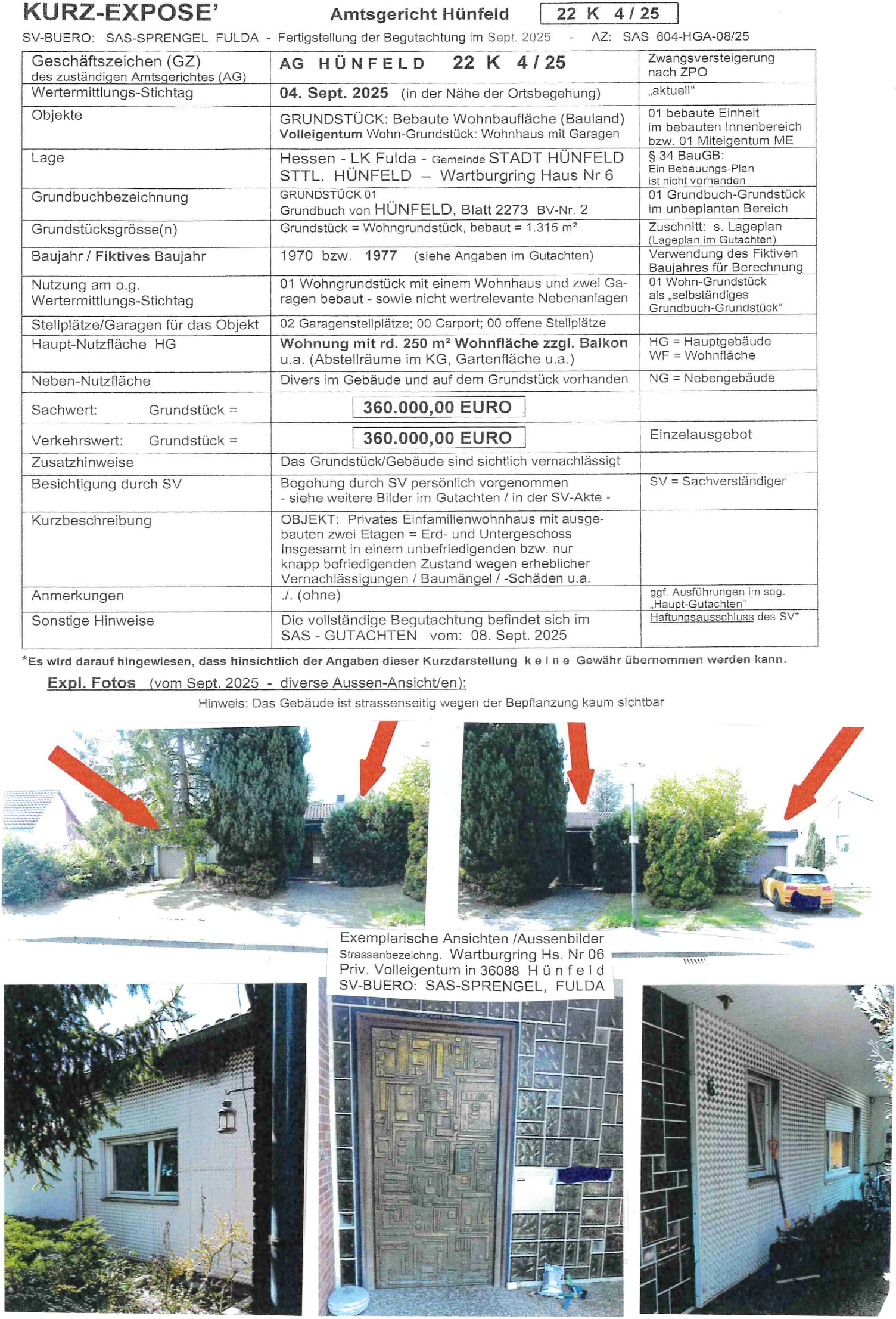 Zwangsversteigerung: Einfamilienhaus in Wartburgring 6, 36088 Hünfeld mit einem Verkehrswert von 360.000 €. Versteigerungstermin am 08.05.2026 am Amtsgericht Amtsgericht Hünfeld, 250 m² Wohnfläche, 1.315 m² Grundstück. Inklusive KI-gestützter Gutachtenanalyse mit Investitions-Score und Mängelbewertung.