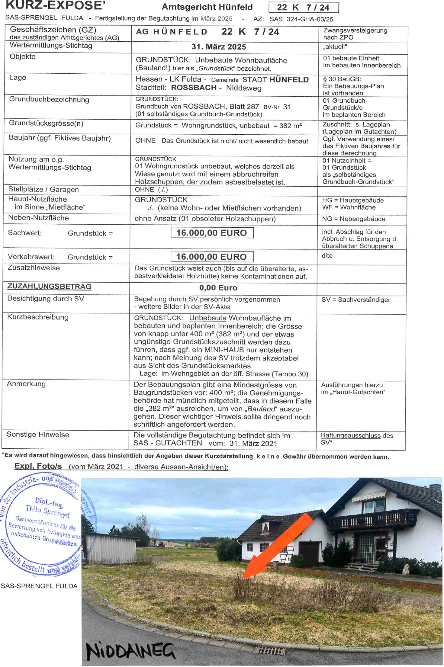 Zwangsversteigerung: unbebautes Grundstück in Niddaweg, 36088 Hünfeld, (Roßbach) mit einem Verkehrswert von 16.000 €. Versteigerungstermin am 24.04.2026 am Amtsgericht Amtsgericht Hünfeld, 382 m² Grundstück. Inklusive KI-gestützter Gutachtenanalyse mit Investitions-Score und Mängelbewertung.