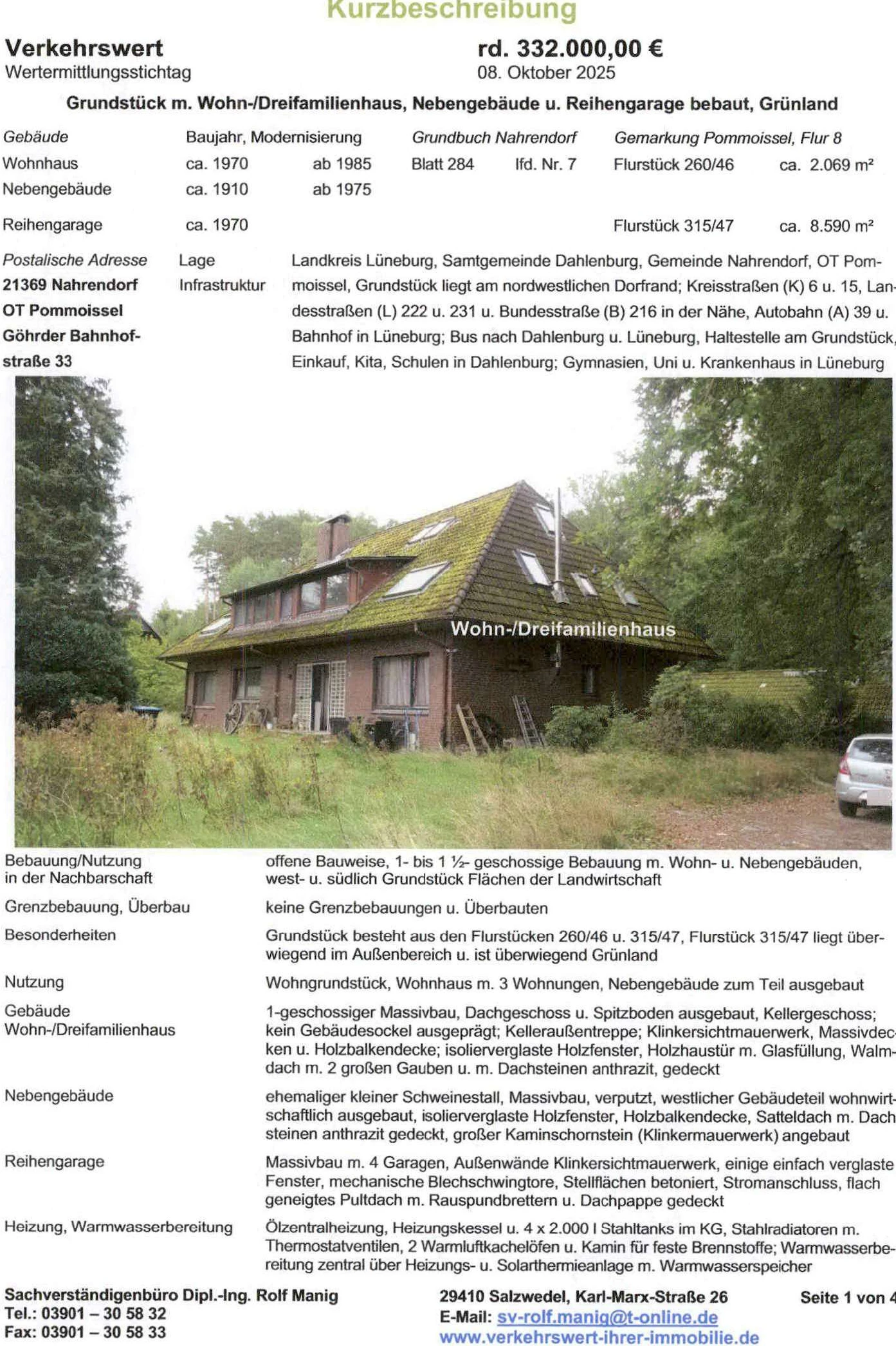 Zwangsversteigerung: Mehrfamilienhaus in Göhrder Bahnhofstraße 33, 21369 Nahrendorf, (Pommoissel) mit einem Verkehrswert von 332.000 €. Versteigerungstermin am 19.05.2026 am Amtsgericht Amtsgericht Lüneburg.