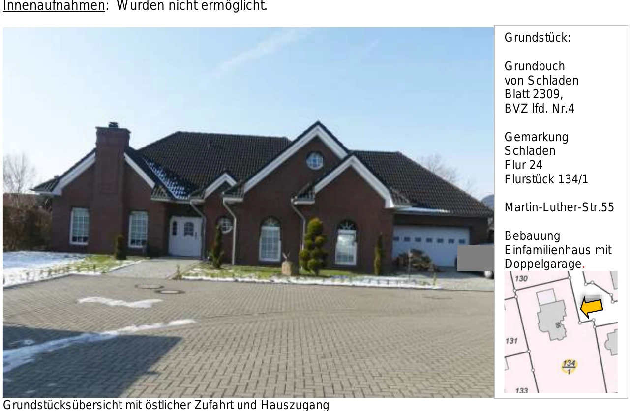 Zwangsversteigerung: Einfamilienhaus mit Doppelgarage in Martin-Luther-Straße 55, 38315 Schladen mit einem Verkehrswert von 383.000 €. Versteigerungstermin am 15.04.2026 am Amtsgericht Amtsgericht Wolfenbüttel, 220 m² Wohnfläche, 1.565 m² Grundstück. Inklusive KI-gestützter Gutachtenanalyse mit Investitions-Score und Mängelbewertung.