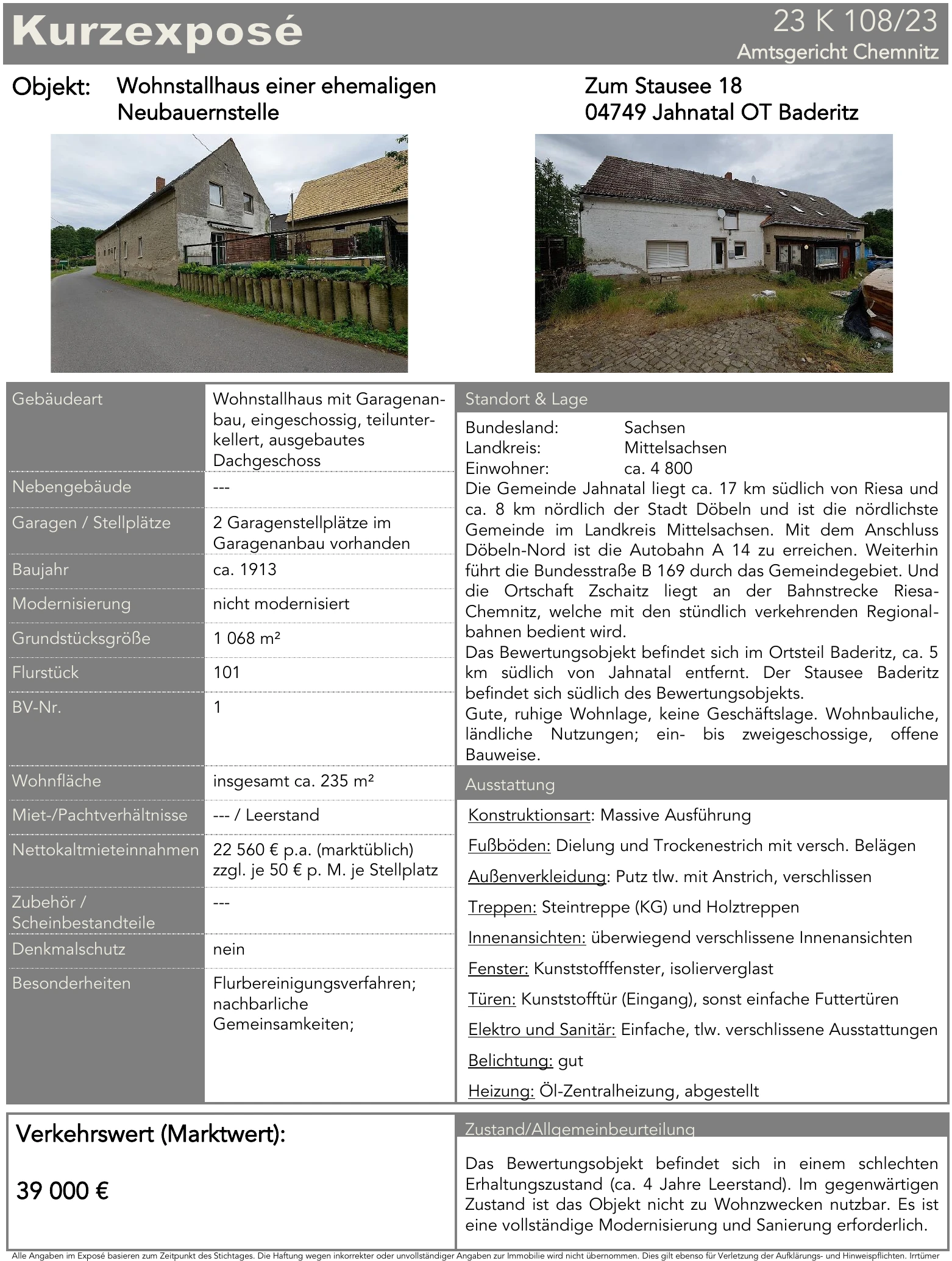 Zwangsversteigerung: Zweifamilienhaus in Zum Stausee 18, 04749 Jahnatal, (Baderitz) mit einem Verkehrswert von 39.000 €. Versteigerungstermin am 19.03.2026 am Amtsgericht Amtsgericht Chemnitz, 235 m² Wohnfläche, 1.068 m² Grundstück. Inklusive KI-gestützter Gutachtenanalyse mit Investitions-Score und Mängelbewertung.