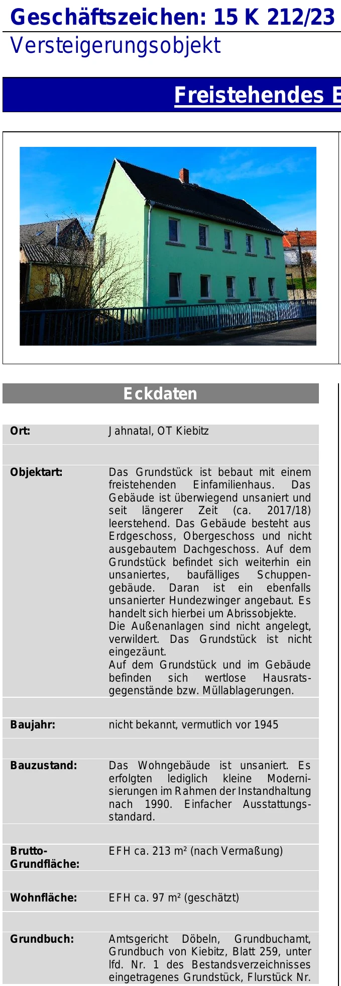 Zwangsversteigerung: Einfamilienhaus in Am Töllschützer Berg 1, 04749 Jahnatal, (Kiebitz) mit einem Verkehrswert von 15.000 €. Versteigerungstermin am 28.04.2026 am Amtsgericht Amtsgericht Chemnitz, 97 m² Wohnfläche, 260 m² Grundstück. Inklusive KI-gestützter Gutachtenanalyse mit Investitions-Score und Mängelbewertung.