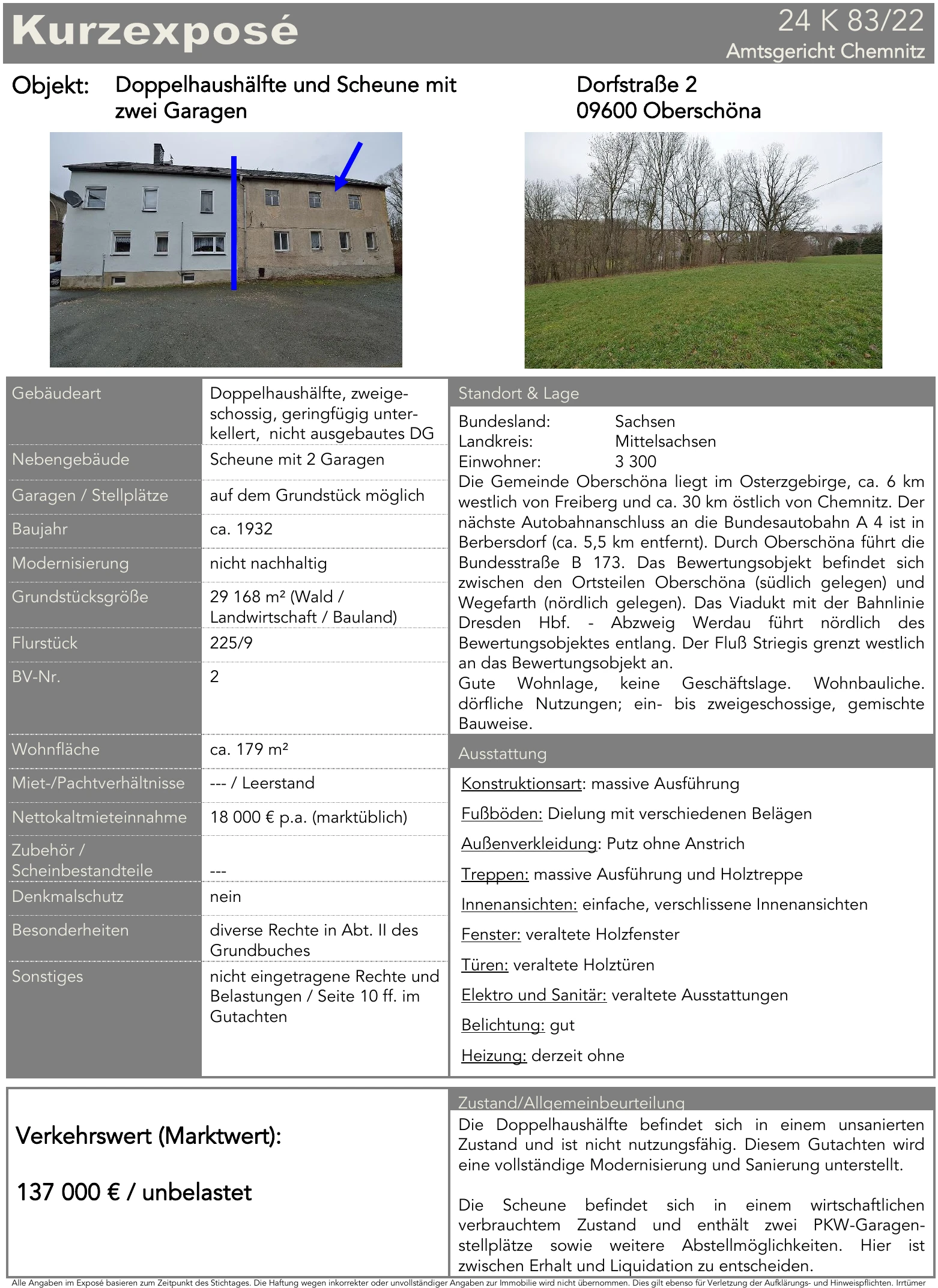 Zwangsversteigerung: Doppelhaushälfte in Dorfstraße 2, 09600 Oberschöna mit einem Verkehrswert von 137.000 €. Versteigerungstermin am 05.03.2026 am Amtsgericht Amtsgericht Chemnitz, 179 m² Wohnfläche, 29.168 m² Grundstück. Inklusive KI-gestützter Gutachtenanalyse mit Investitions-Score und Mängelbewertung.
