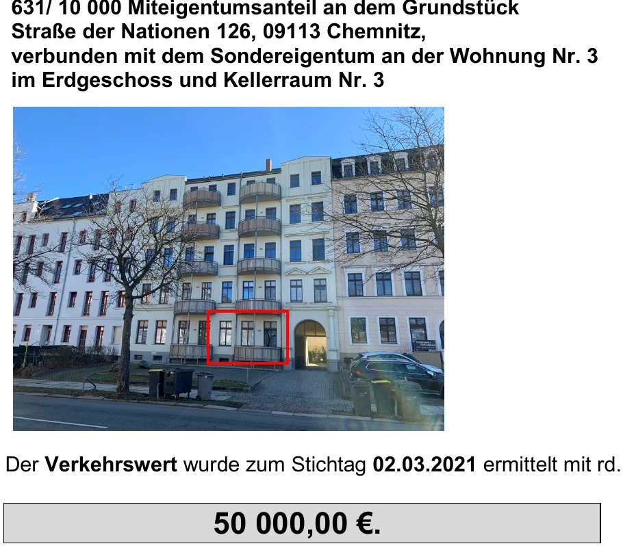 Zwangsversteigerung: Eigentumswohnung (1 bis 2 Zimmer) in Straße der Nationen 126, 09113 Chemnitz mit einem Verkehrswert von 50.000 €. Versteigerungstermin am 12.03.2026 am Amtsgericht Amtsgericht Chemnitz, 51 m² Wohnfläche, 700 m² Grundstück. Inklusive KI-gestützter Gutachtenanalyse mit Investitions-Score und Mängelbewertung.