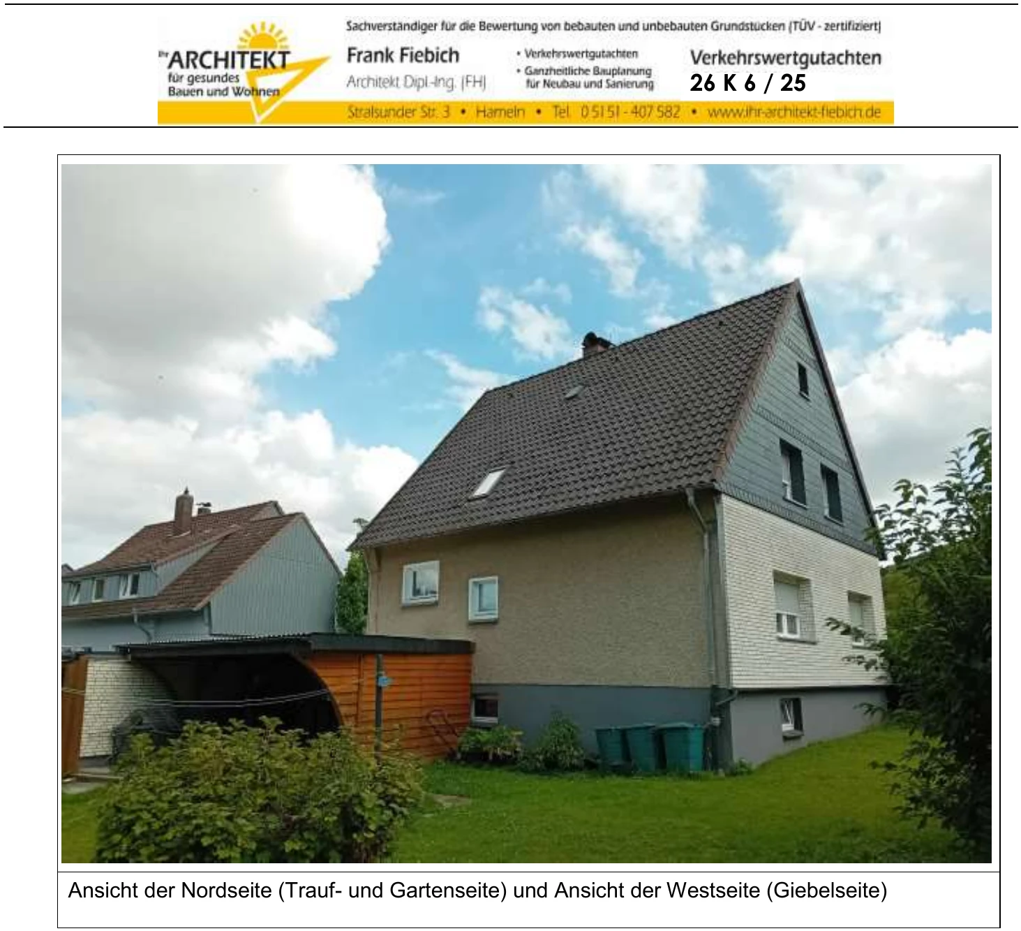 Zwangsversteigerung: Einfamilienhaus mit Garage in Felsenkellerweg 6, 31863 Coppenbrügge, (Coppenbrügge) mit einem Verkehrswert von 245.000 €. Versteigerungstermin am 17.04.2026 am Amtsgericht Amtsgericht Hameln, 116 m² Wohnfläche, 853 m² Grundstück. Inklusive KI-gestützter Gutachtenanalyse mit Investitions-Score und Mängelbewertung.